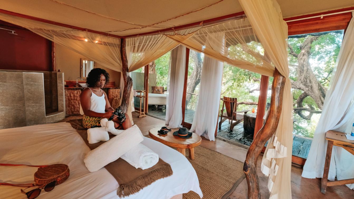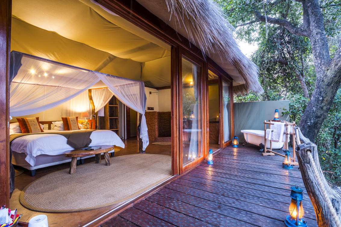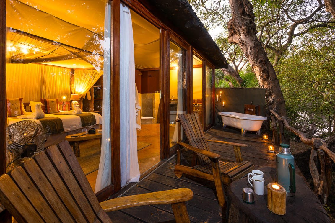 Four Luxury tents that have a private deck with comfy seating overlooking the Kafue River. This is our most luxurious accommodation with each unit privately surrounded by natural riverine bush. A freestanding ball and claw bathtub is found on each deck. Further enhancing the African theme, the furniture is made out of recycled wood from Dhows that used to sail the Indian Ocean off Tanzania.