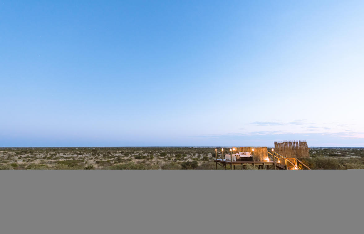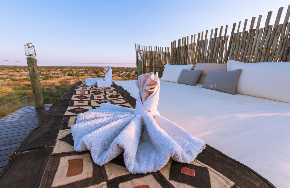 Located in a secluded spot at the far end of the camp, the sleep-out deck is an intimate experience for two, who wish to spend a wonderous evening under the impressive Kalahari night sky. The raised deck comprises 2 three-quarter beds, a washbasin and a toilet. Guests will be walked to the deck after dinner to spend the night, and can resume game activities in the morning as usual.