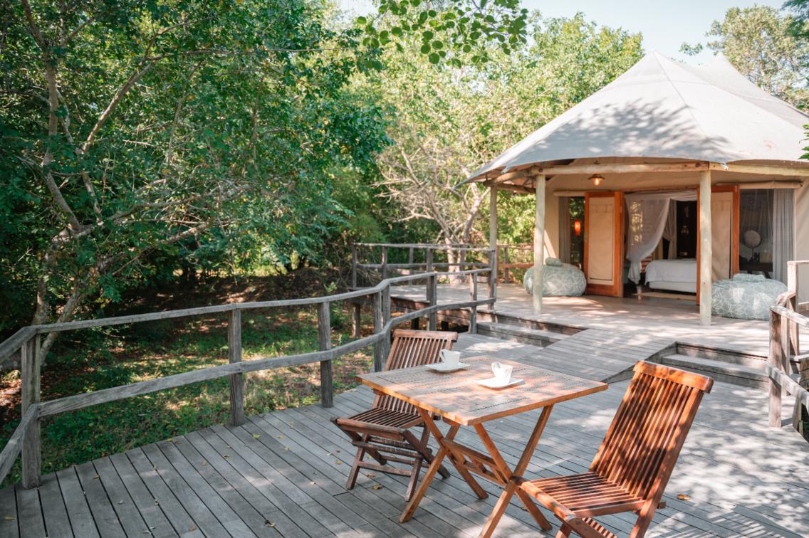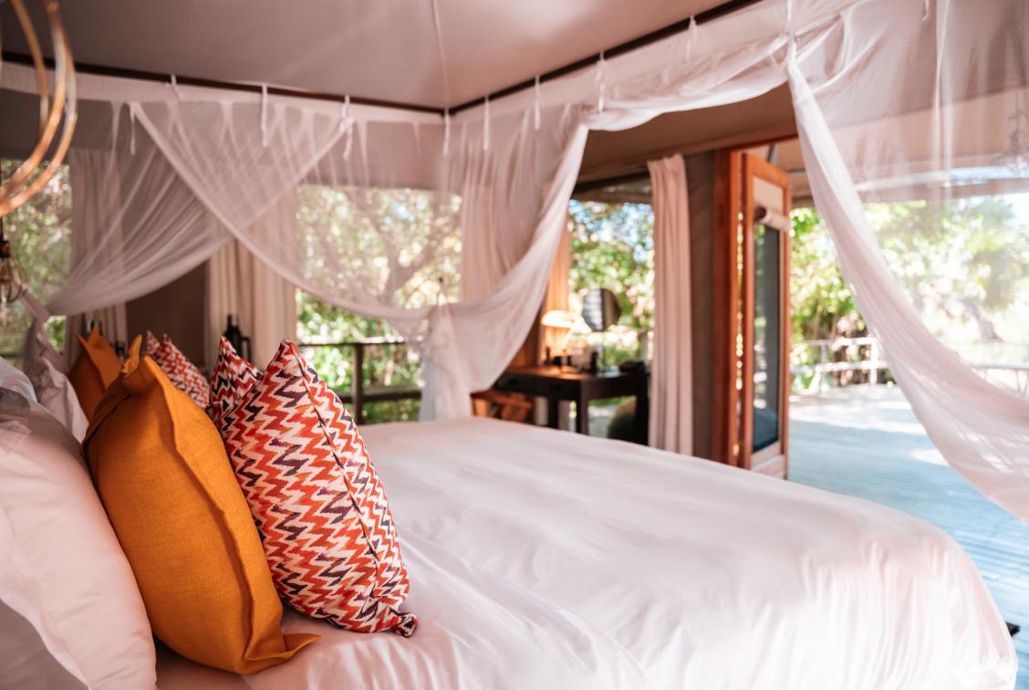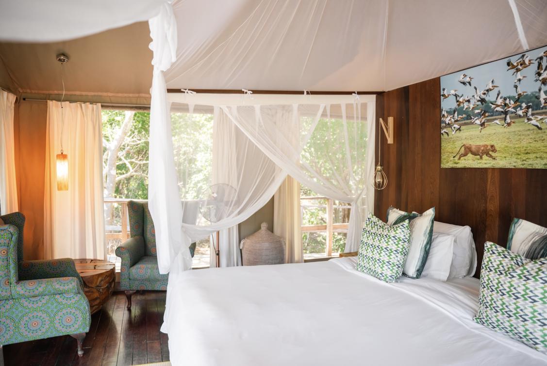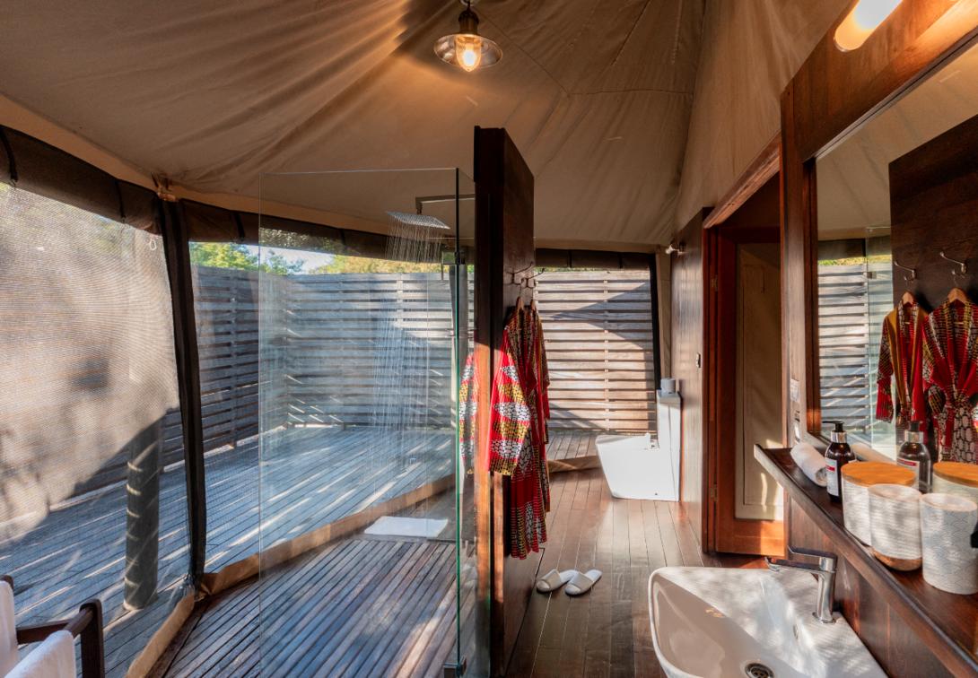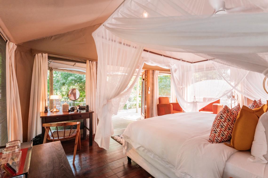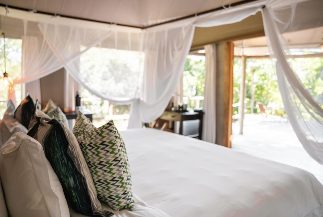Raised above the ground and discreetly positioned along the riverbank, Muzimu Lodge’s six tented suites are designed in classic East African style, offering a quiet, elegant retreat after a day in the bush. Each canvas tent opens onto a private timber deck with views of the surrounding landscape. Inside, king-sized beds (twin available), fine linens, en-suite bathrooms, ceiling fans, in room wifi and thoughtful touches ensure comfort without excess. Simplicity here is intentional, allowing the beauty of Gorongosa to take centre stage, while every detail — from the filtered light to the soft sounds of nature — contributes to a sense of serenity and connection.