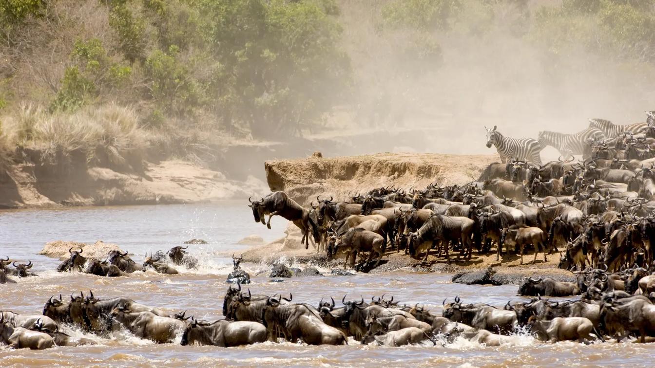 Witness the breathtaking spectacle of the Great Migration, as the wildebeests and zebras cross the crocodile-infested Mara River.