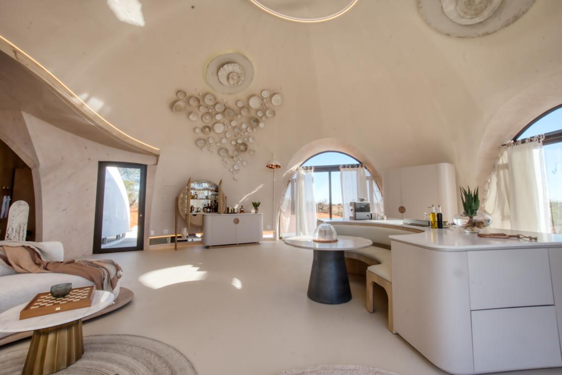 Creatively constructed with sublime desert views, the Reverie Kalahari Pod is designed as a luxuriously special desert retreat for two. Pad around your open-plan lounge and dining area with its well-stocked bar and fully-equipped kitchen. Unlimited free Wi-Fi.