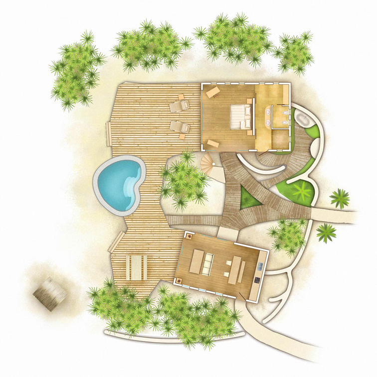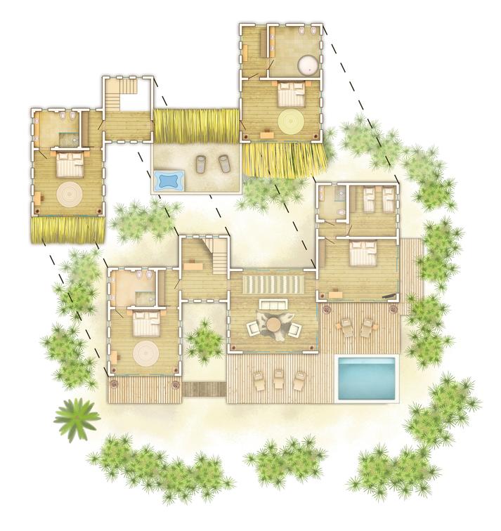 The Family Two-Bedroom Villa is a luxurious retreat, perfect for families or small groups. Surrounded by lush gardens, this private villa features two en-suite bedrooms connected by an external staircase, each with a king-size bed (convertible to twins), a rain shower, and separate toilets.
