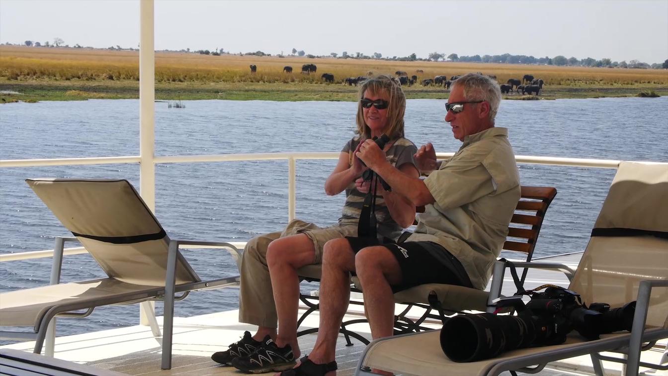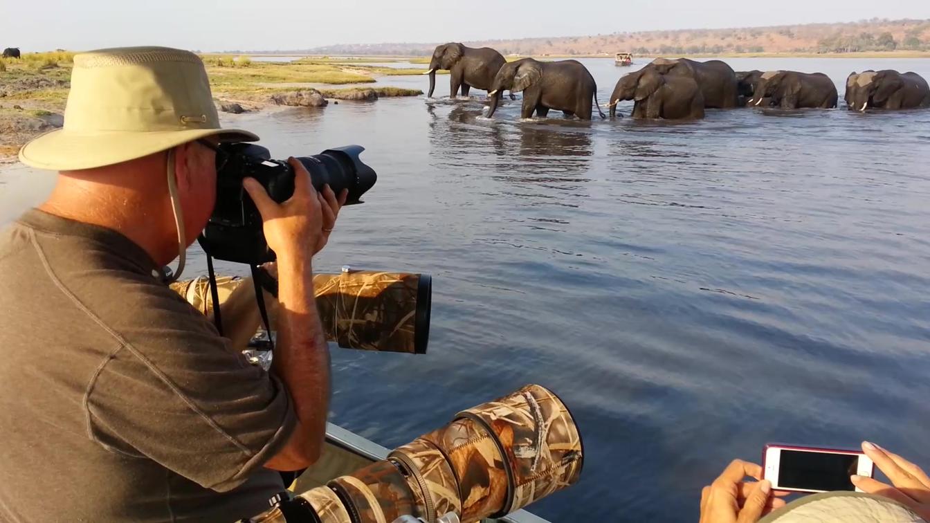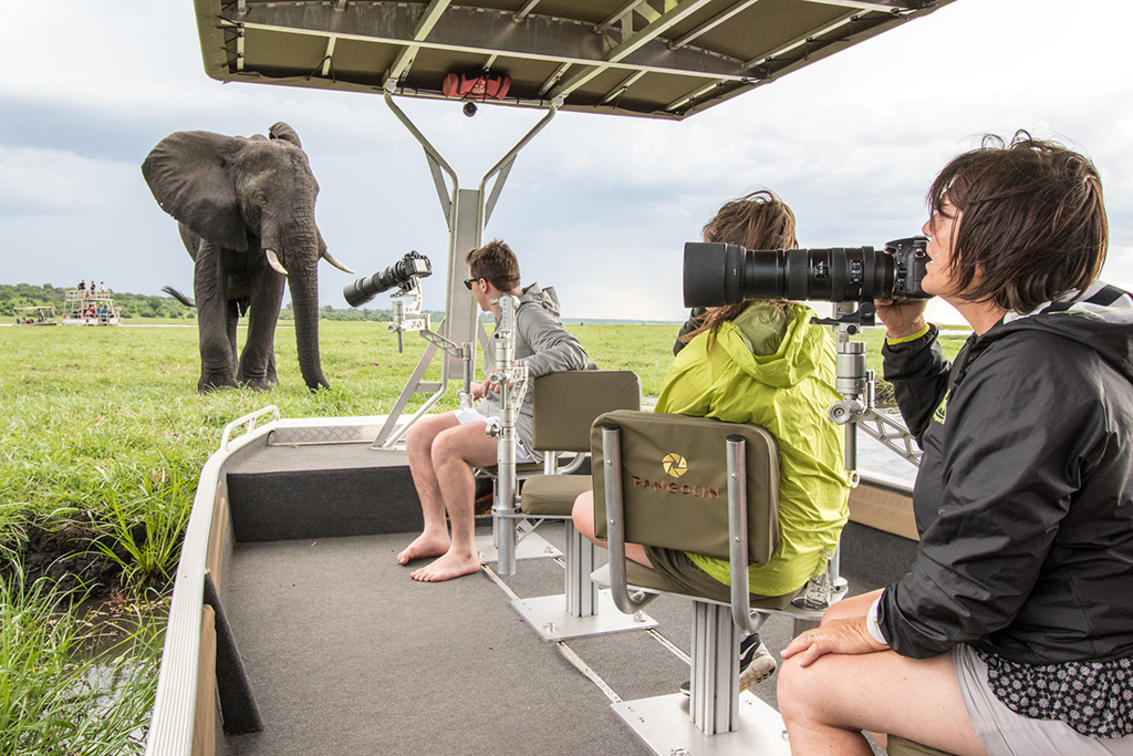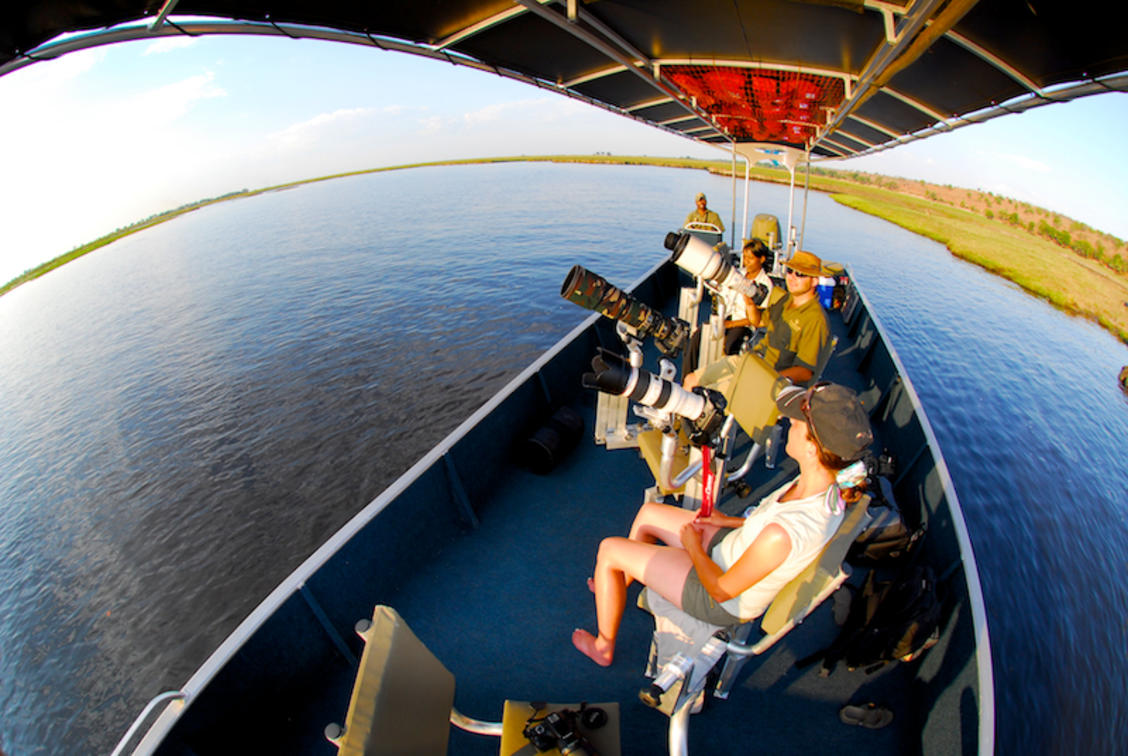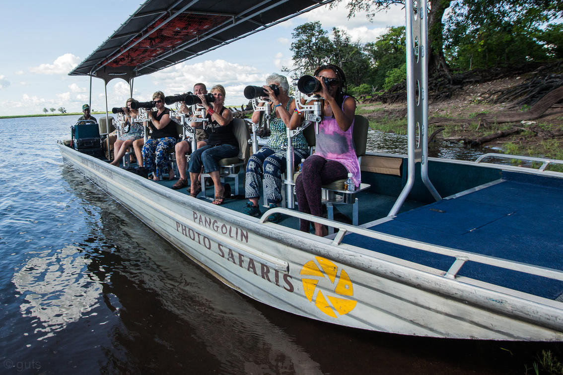 We are incredibly proud of the innovations that went in to our Photo Boat! Designed by Aliboats of Maun and ourselves, we believe that we have struck the perfect balance between functionality, usability, space and comfort. Each of our eight seats rotate a full 360 degrees and the mounting, designed and built by our very own Guts, is based on a lightweight machine gun mounting used by the South African army. The mounting design is so simple and effective that guests will master its movement in no time at all. Clients travelling with their own lenses simply attach one of our base plates to their lens collar and they are ready to go. Simple and photography friendly! Please note that you will have to have your own cameras and lens (with a collar) to make the most of the photo boat as we don’t supply cameras onboard the houseboat.