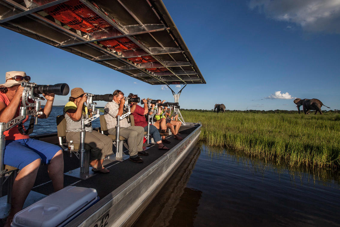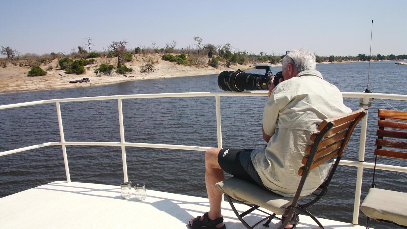 When designing the boat we agonized whether to have a roof. When we operated in the prime viewing months and the height of the dry season, we are glad that we had one fitted! The African sun can be punishing and there is no greater distraction to a photographer than being baked and sweating profusely while trying to compose an image. The roof is positioned as high as possible and is over 2m at its lowest point inside. This height does not affect our ability to capture birds in flight and as there are only supports at either end it means that there is no obstruction on either side for any client.