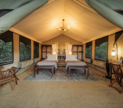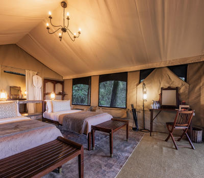 The eight luxury safari tents offer either twin or double beds, each with spacious ensuite bathroom areas. The tents have a very classy and elegant feel, combining Indian Raj Campaign furniture, dark wood with intricate brass fittings,