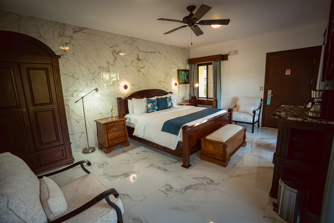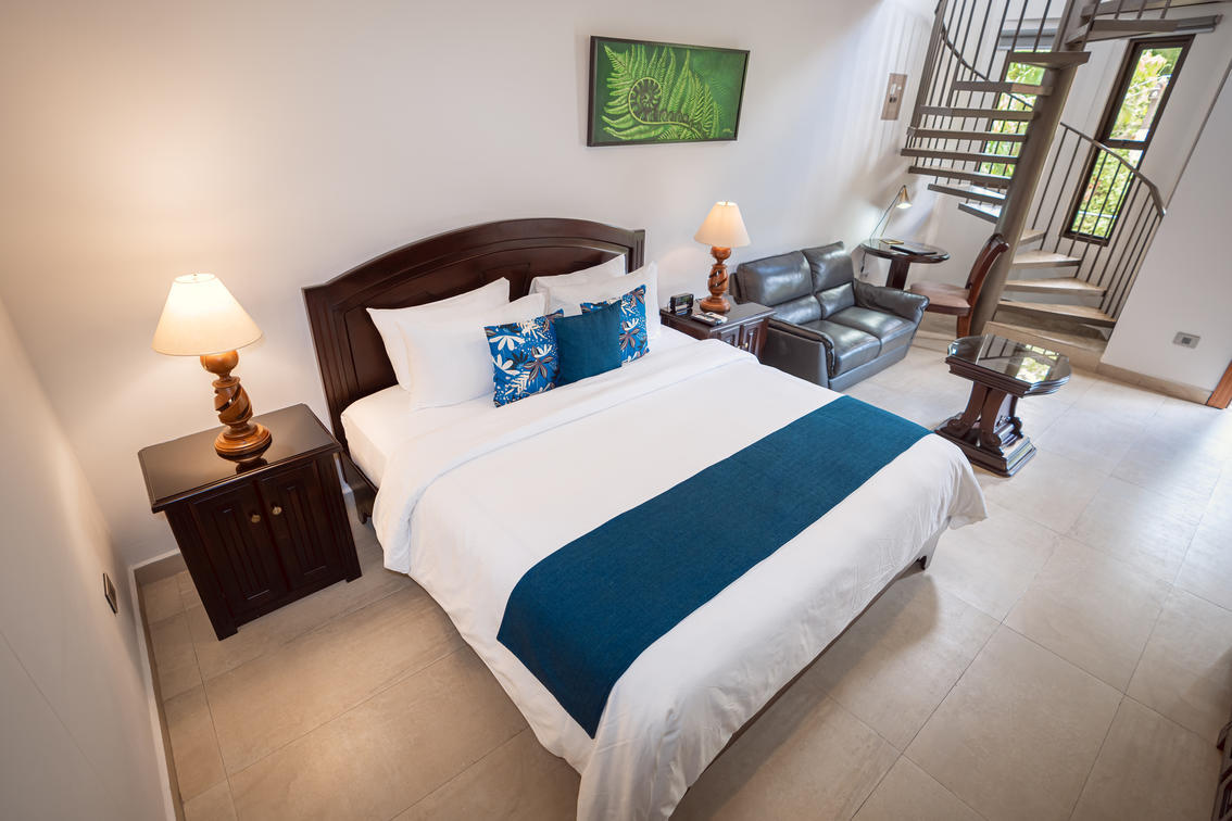 Moderna y lujosa suite equipada con una cama king para dos personas, terraza superior de acceso con elegante escalera caracol o balcón e increíbles vistas panorámicas, Smart TV, A/C.