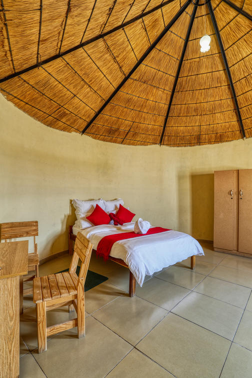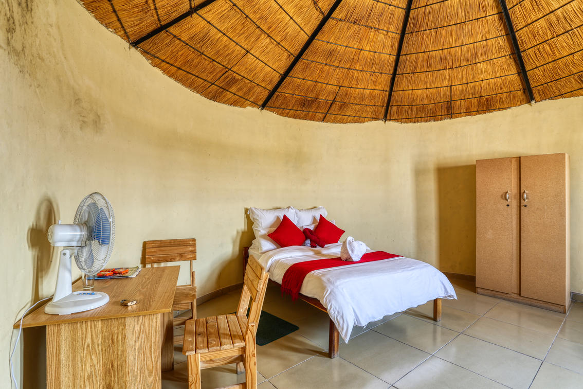 Our standard bungalows include a double bed, a fan, table and chairs, warm water, a shower and a toilet.
