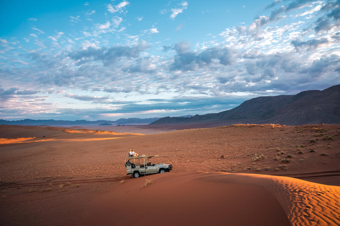 A shorter a drive to a prime sundowner spot. Spot oryx and other wildlife preparing for nightfall, set against the stunning Namibian sky, before enjoying a perfectly prepared G&T as you watch the sun dip below the dramatic desert expanse.
