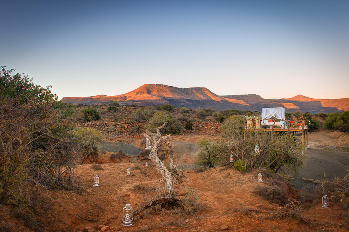 Samara's star bed offers an unforgettable romantic wilderness experience. Located in total seclusion in a riverside location, the mosquito net covered four-poster bed sits atop a raised platform with panoramic views of mountain and sky, designed for tranquil nights absorbing the serenity of the Great Karoo landscape.