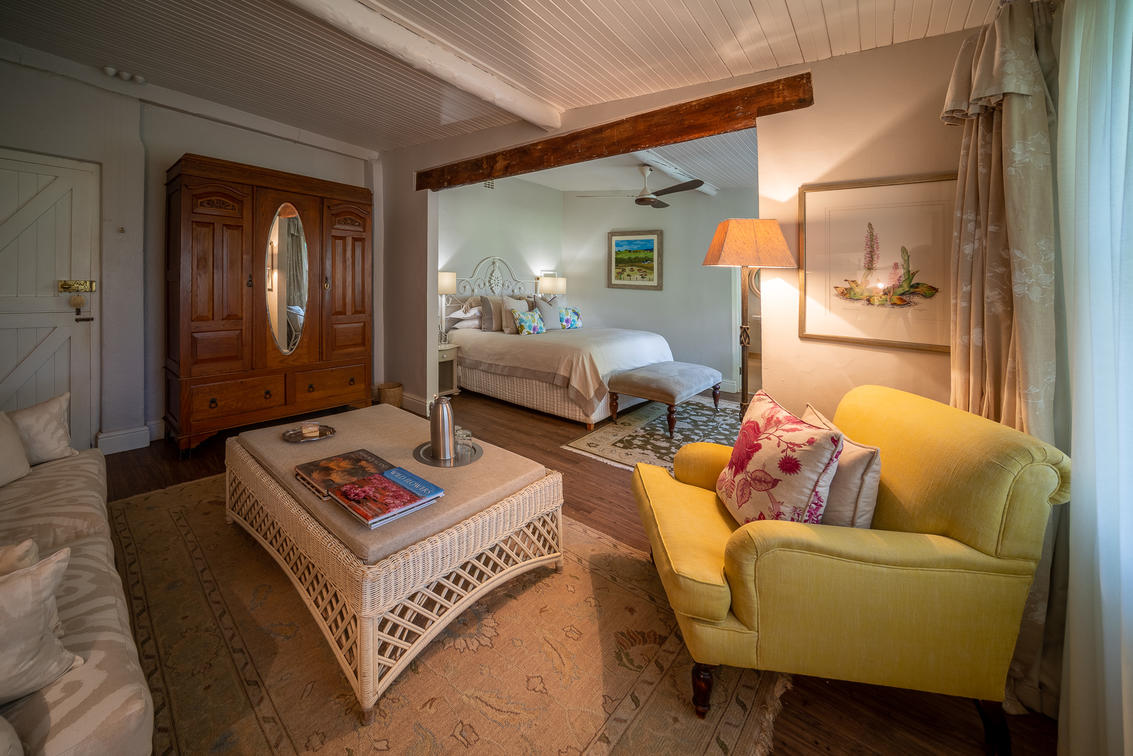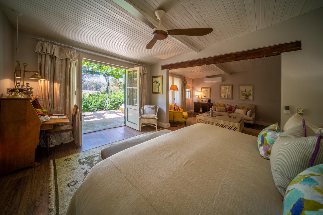The Orchid Suite includes a King size bed, separate shower and bath, private lounge and veranda, airconditioning, under floor heating and fan, hairdryer, slippers, gowns, towels and toiletries. Finishes everywhere are luxurious and stylish, with crisp cotton bedding and elegant fabrics. The Conservatory Restaurant, where brunch, high tea and dinner are served, is a short stroll across the back garden.