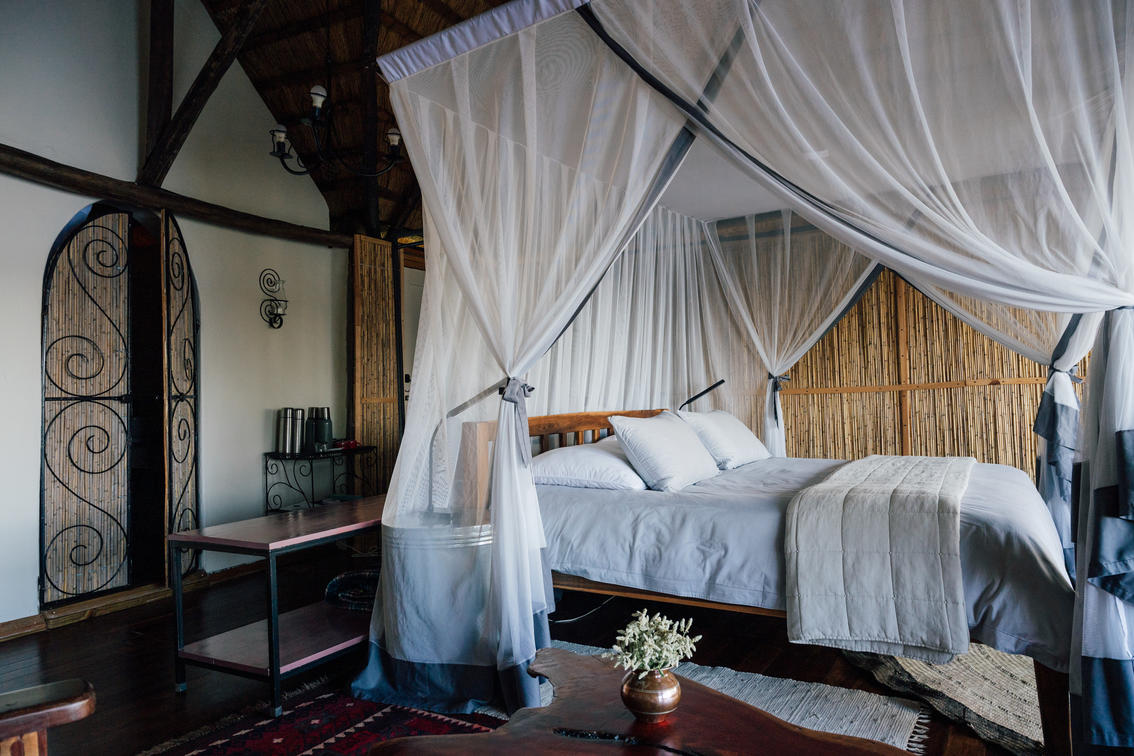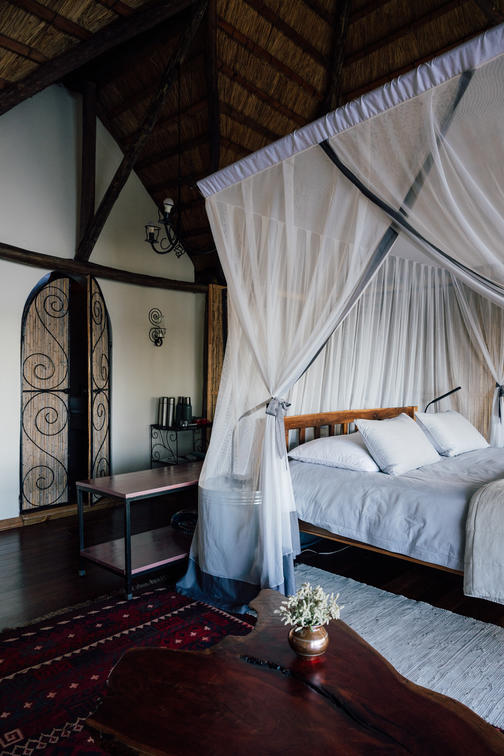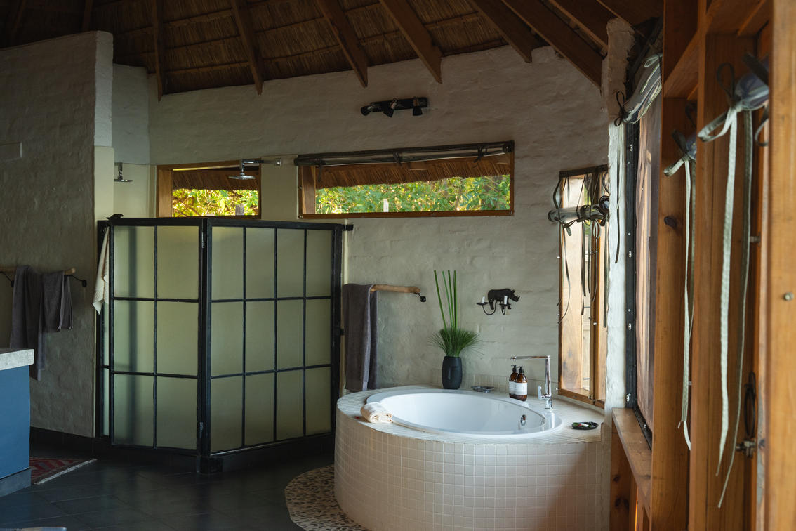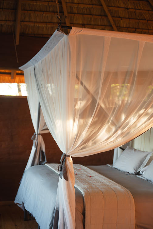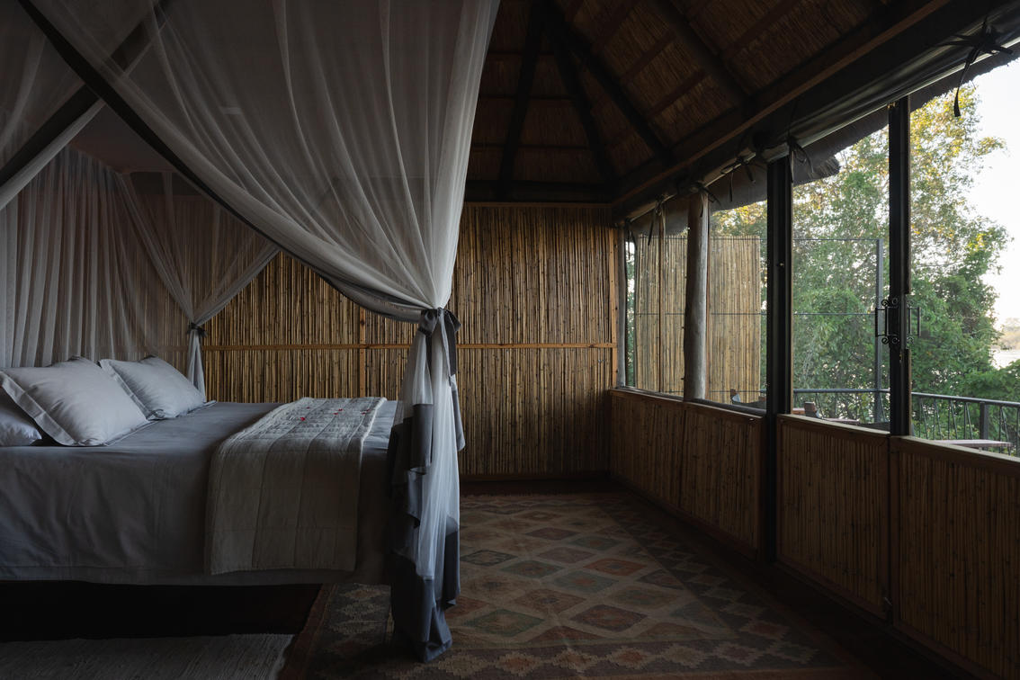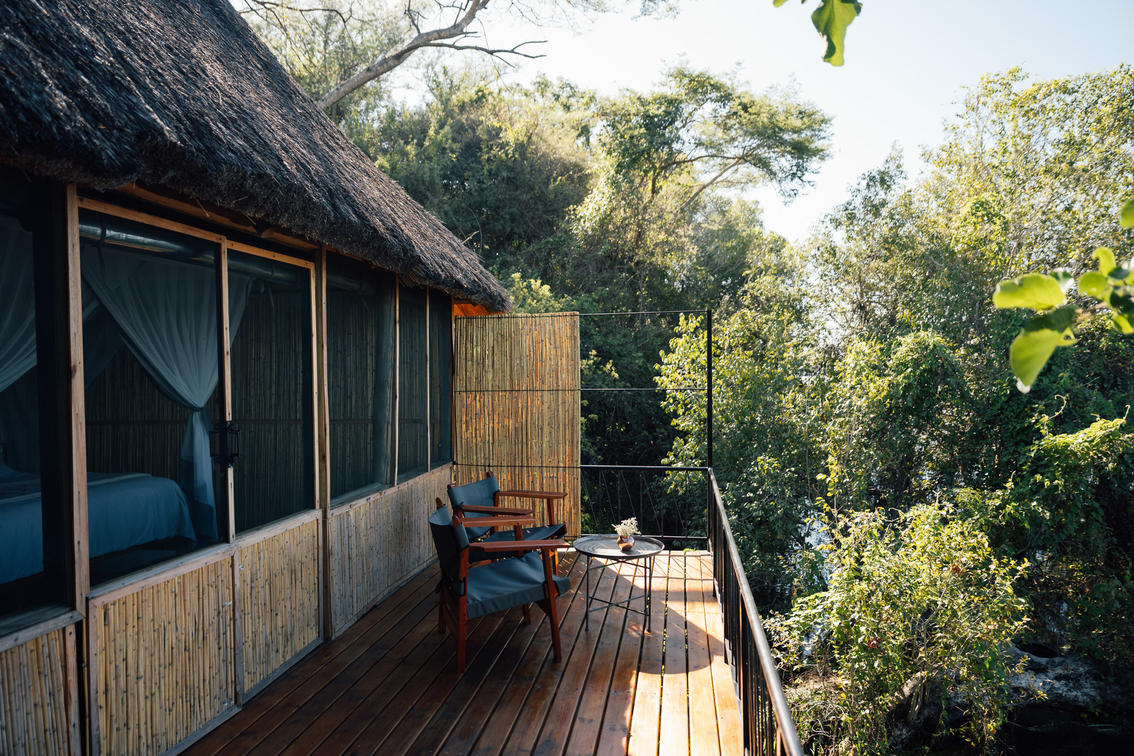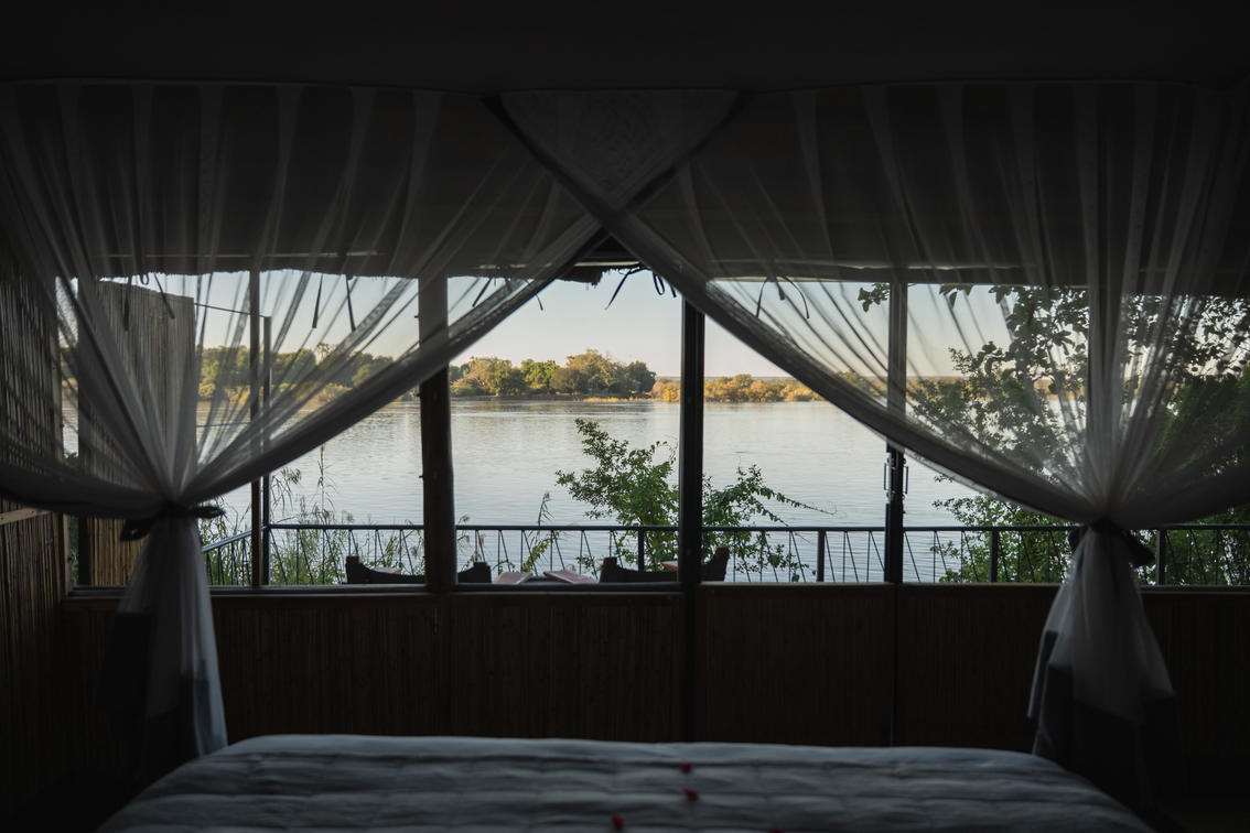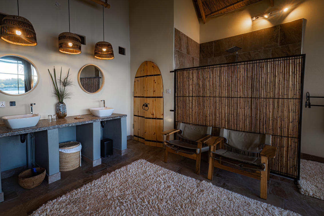 Bee Eater River Chalet is a spacious and beautifully appointed chalet offering sweeping panoramic views of the Zambezi River. Designed with luxury and comfort in mind, this elegant retreat features a king-size bed, double vanity basins, and a generous walk-in shower. Step outside onto your private deck and unwind in the freestanding outdoor bathtub — the ultimate bush-and-bath experience under the African sky. The chalet is thoughtfully designed to bring the outdoors in, with screened gauze windows allowing for maximum natural light, fresh air, and uninterrupted river views. Roll-down blinds and curtains are provided for added privacy and comfort. Sleeps: 2 guests