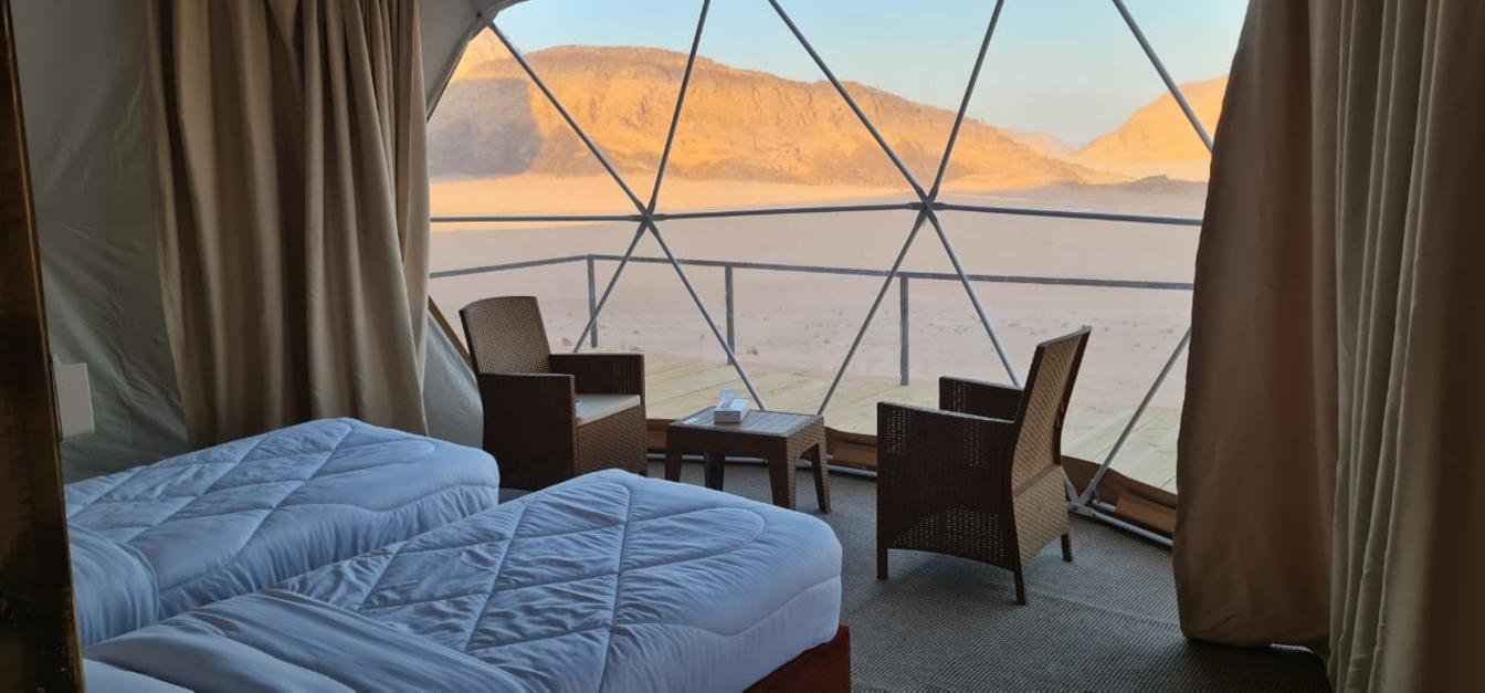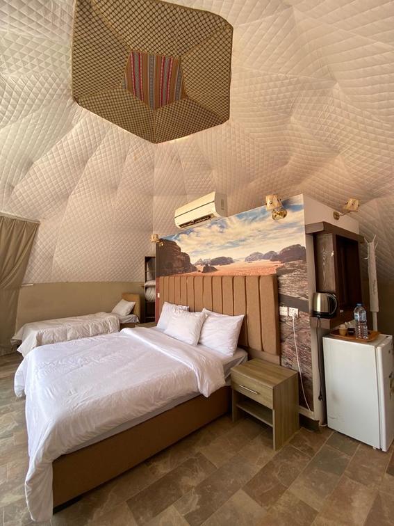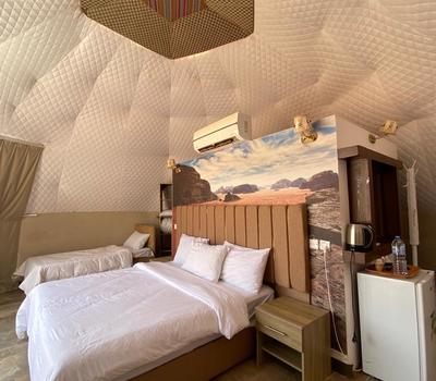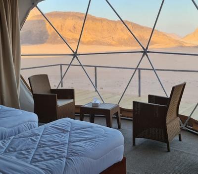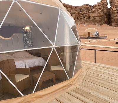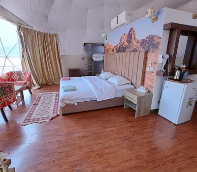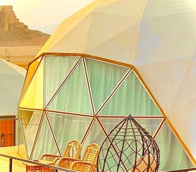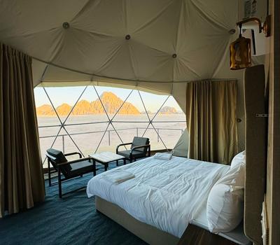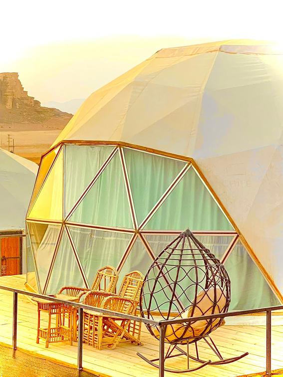 Enjoy a luxurious desert glamping experience in our Martian Dome Tent. Designed with panoramic glass walls, these domes offer spectacular views of the desert and the star-filled night sky. Each dome is elegantly furnished and features a private bathroom, modern amenities, and climate control to ensure maximum comfort year-round. Perfect for couples, families, or small groups seeking an unforgettable stay.