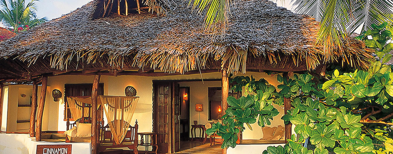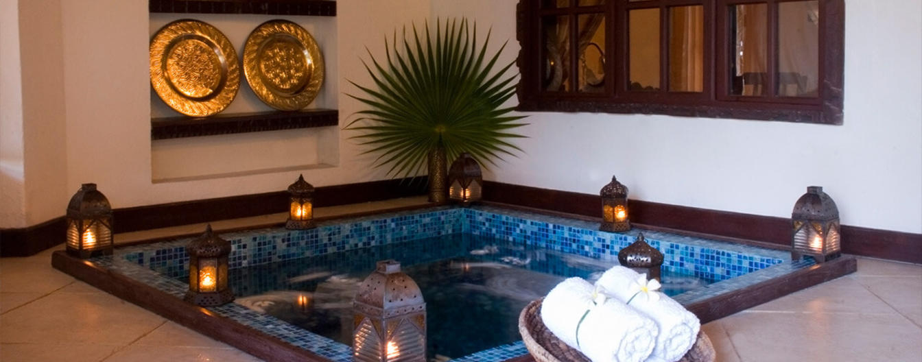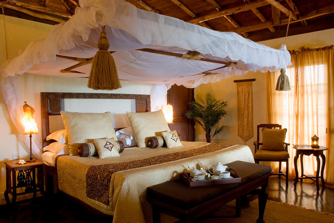 Each villa features a sophisticated interior composition in all colors of coffee and cream where filmy caramel colored curtains billow, dark grained polished floors extend and the decor is a unique marriage of colonial grandeur and traditional design. On the veranda, a silk-draped four-poster Zanzibar Bed accents a sunken, midnight blue plunge pool with long views of the Indian Ocean.