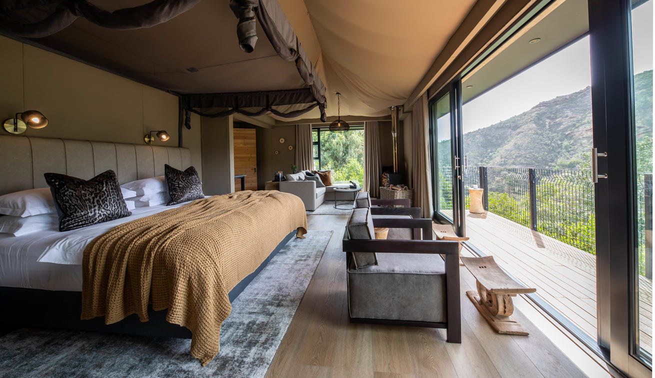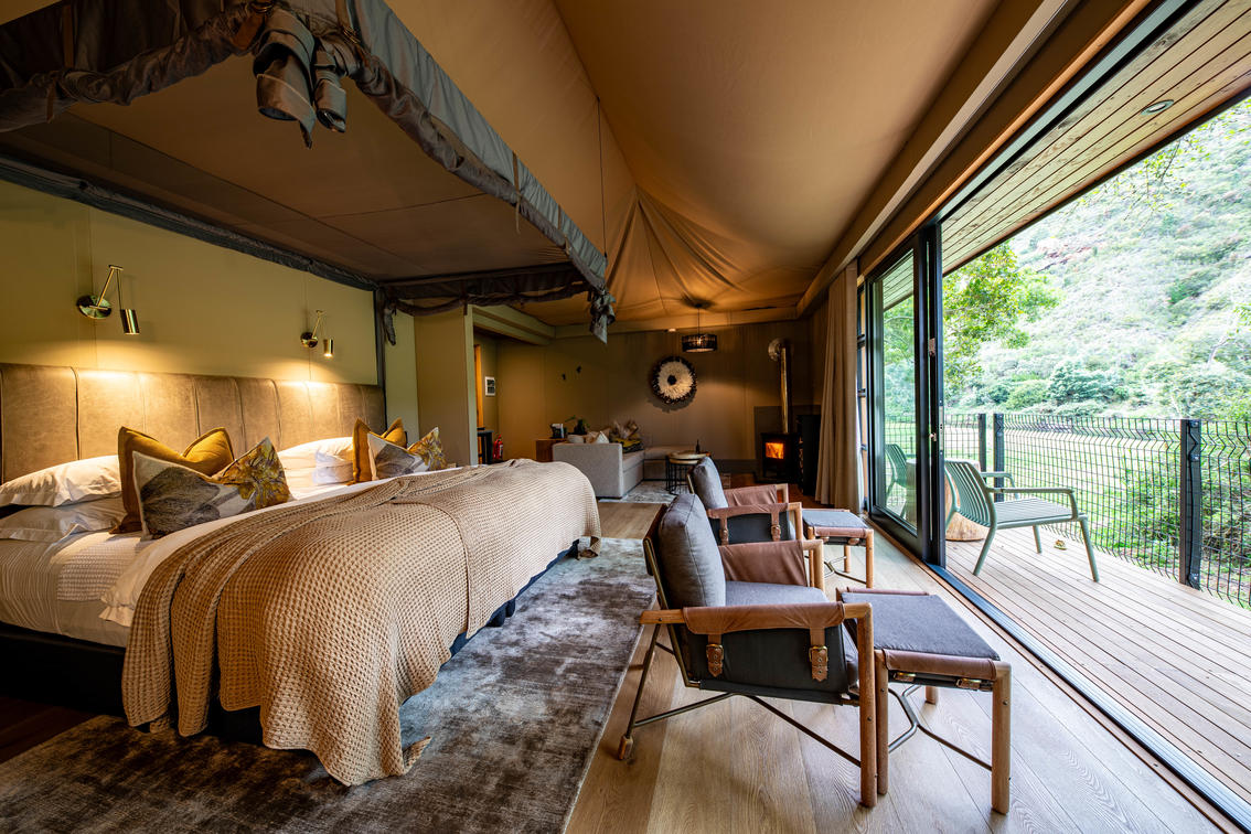 Experience refined luxury in Botlierskop’s Superior Tented Suite, a romantic riverside retreat with captivating mountain views and possible wildlife sightings. This elegant haven features an extra king bed with plush linens, an en-suite bathroom with both an indoor shower and private outdoor shower—perfect for couples to enjoy nature’s calm—and a smart TV for cozy, tech-savvy evenings. Modern comforts like free WiFi and air-conditioning, paired with double-glazed windows for ideal temperature control, ensure ultimate relaxation. Step onto your private deck to admire the Outeniqua Mountains or glimpse antelopes at dusk, crafting intimate moments for a secluded getaway. With laminated flooring and canvas walls, this suite blends rustic charm with sophisticated luxury, ideal for couples seeking a blend of technology and romance on their safari escape.