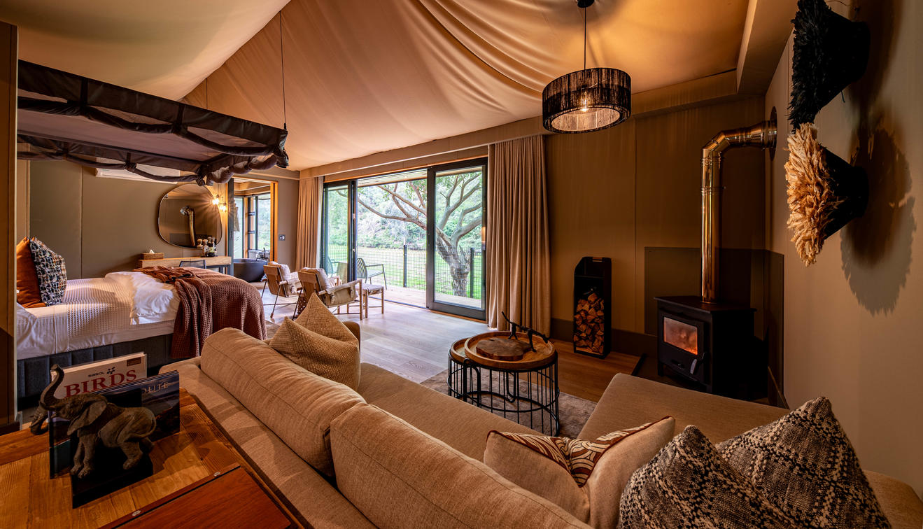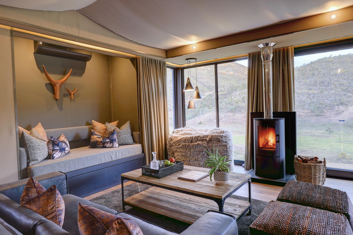 Indulge in luxury at Botlierskop’s Luxury Tented Suite with Fireplace, perched along the river with stunning mountain views and reserve glimpses. This newly renovated retreat features an extra king bed with plush linens, a cozy lounge with a crackling fireplace—ideal for romantic evenings—and an en-suite bathroom with an oval bath and indoor shower, blending nature’s tranquility with modern comfort. Double-glazed windows ensure perfect temperature control, while free WiFi and air-conditioning add convenience. Step onto your private deck to admire the Outeniqua Mountains or spot antelopes at dusk, creating intimate moments for couples seeking a secluded escape. With laminated flooring and canvas walls, this suite offers a harmonious fusion of rustic charm and luxury, perfect for a romantic safari getaway.