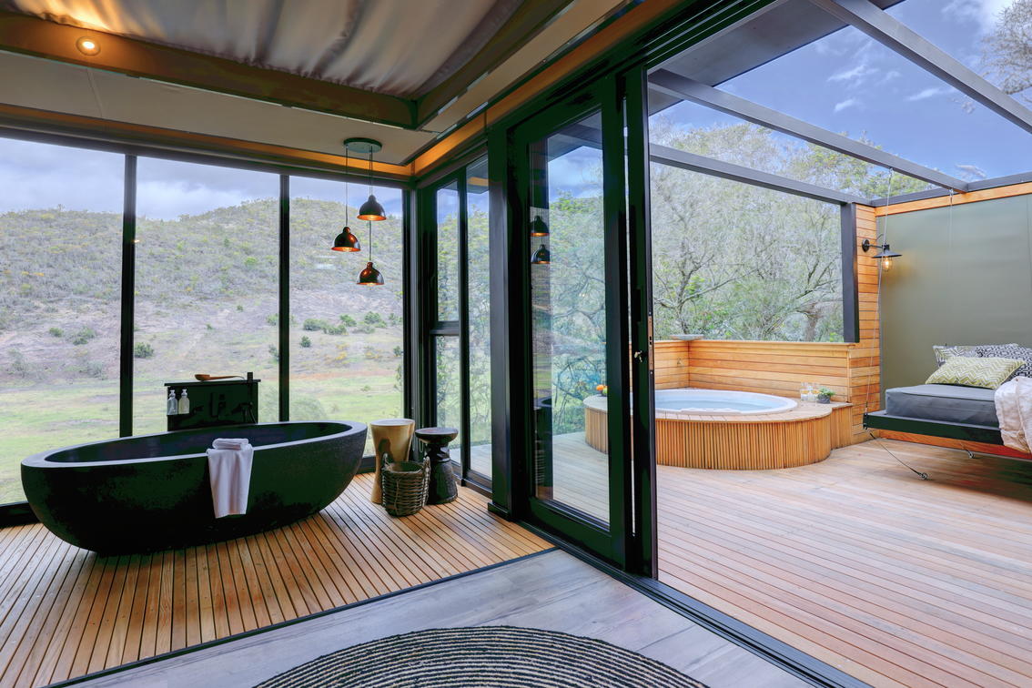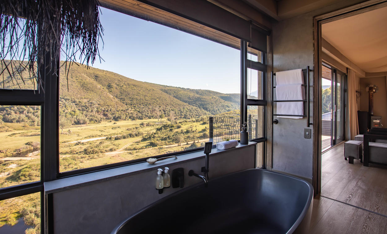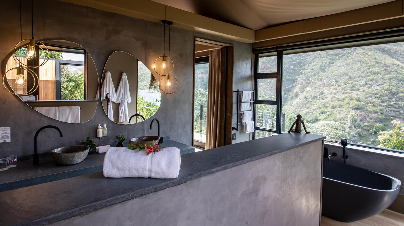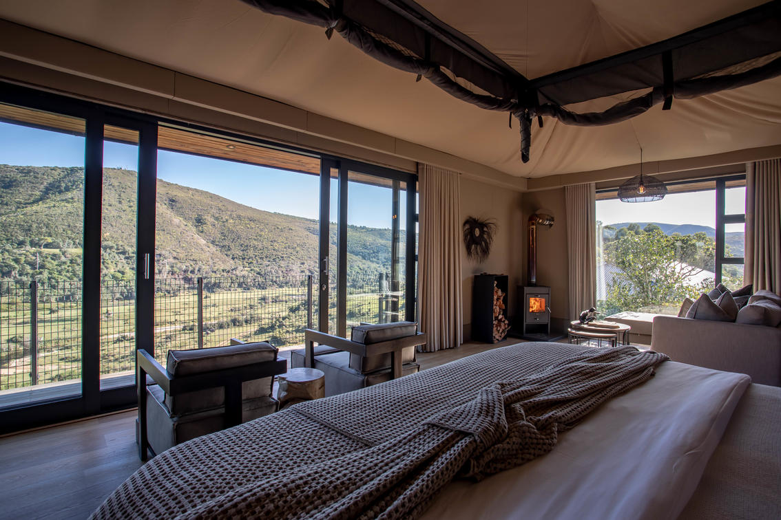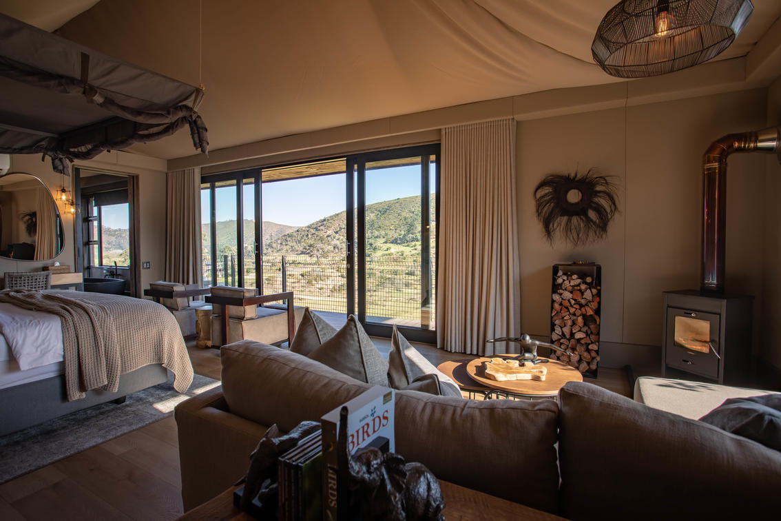 Escape to the Deluxe Tented Suite at Botlierskop, a luxurious riverside retreat offering stunning mountain views and possible wildlife sightings. This romantic haven features an extra king bed with plush linens, an en-suite bathroom with both an indoor shower and a private outdoor shower—perfect for couples to immerse in nature’s serenity—and modern comforts like free WiFi and air-conditioning. Double-glazed windows ensure optimal temperature control, while the suite’s design offers enhanced privacy and subtle elegance. Step onto your private deck to admire the Outeniqua Mountains or catch glimpses of antelopes at dusk, creating intimate moments for a secluded getaway. With laminated flooring and canvas walls, this suite blends rustic charm with refined luxury, ideal for couples seeking an unforgettable safari romance