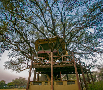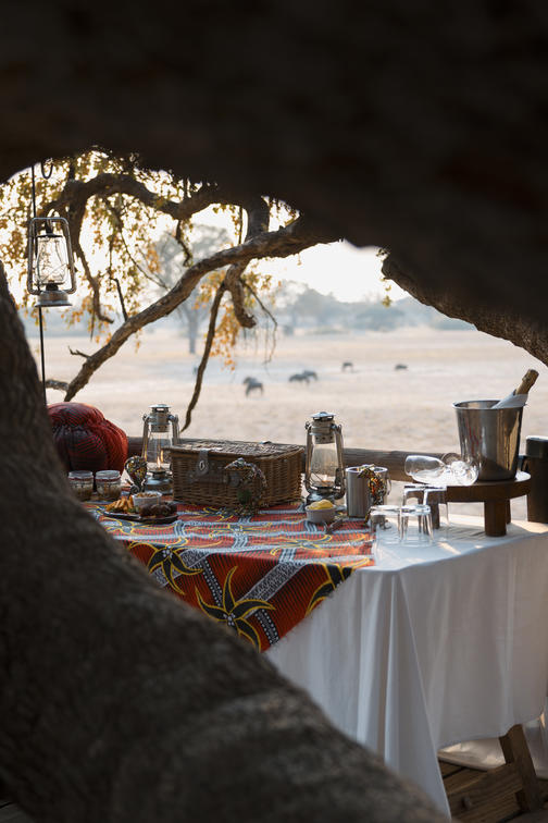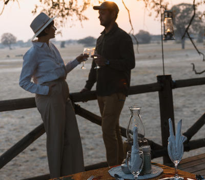 Overlooking the open tree-lined vlei and pan where giraffe and elephants commonly come to drink, this wildly romantic gem is a perfect vantage point from which to view wildlife safely, quietly. Just the two of you. Kept simple, as a tree-house should be, the bedroom of the Dove’s Nest is reached by a wooden stairway and trap door. Guests are dropped off after the afternoon activity and dinner and drinks await.