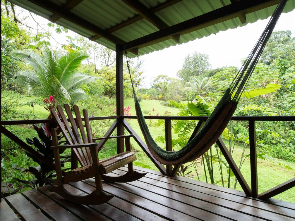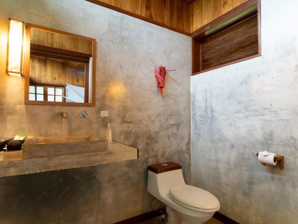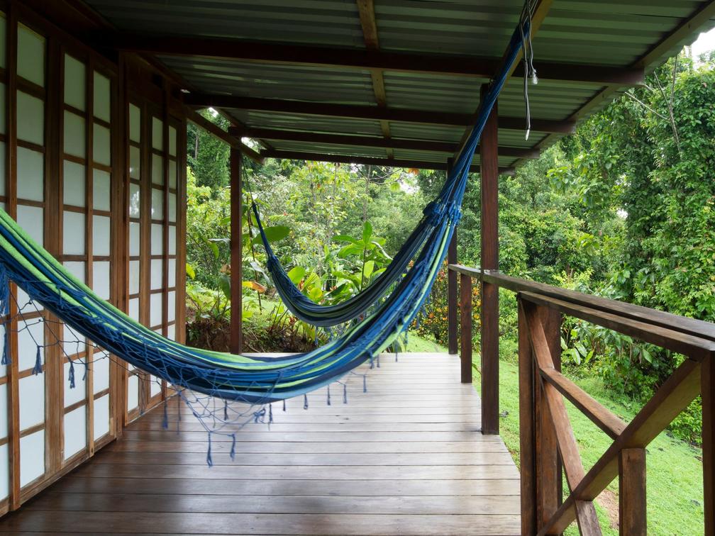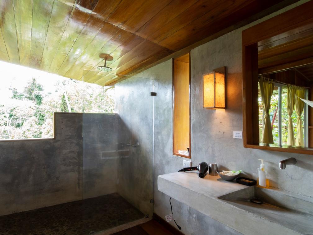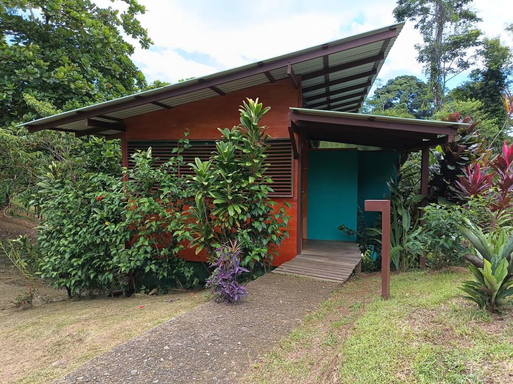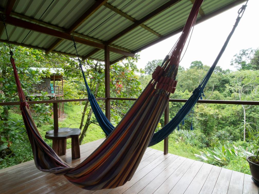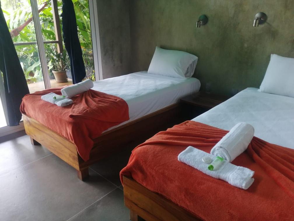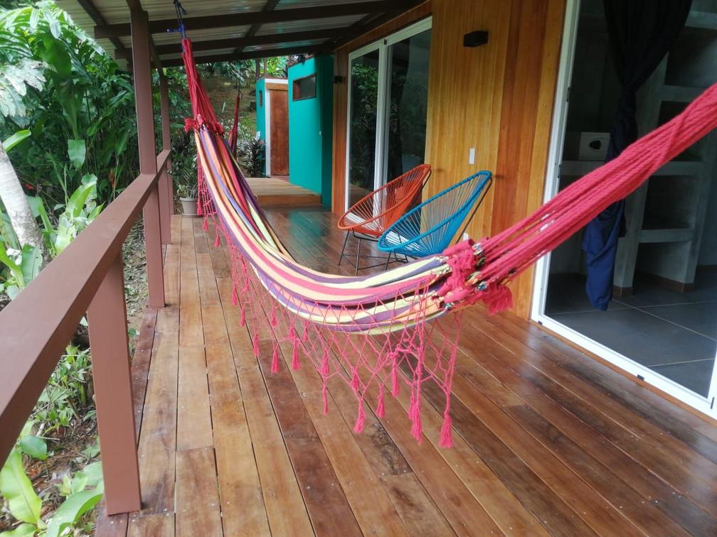 Our family room at Finca Maresía is designed to provide a cozy and spacious environment. The cabin consists of two separate bedrooms, featuring a private bathroom with two showers and two toilets, offering comfort and privacy for all members of your family or group of friends. Additionally, it includes a private terrace equipped with comfortable hammocks and chairs, where you can relax and enjoy the garden views.