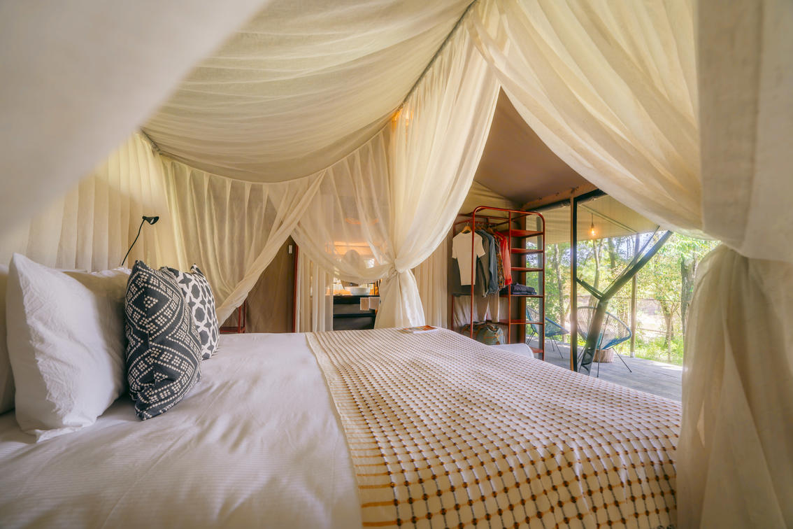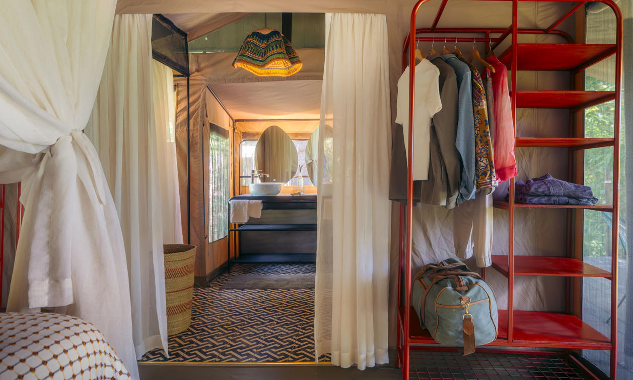 Tucked into the tree canopy and overlooking the flowing river, Emboo’s River Suites blend modern design with nature’s rhythm. Inspired by the vibrant Lilac Breasted Roller, the colours reflect the wild beauty around you.