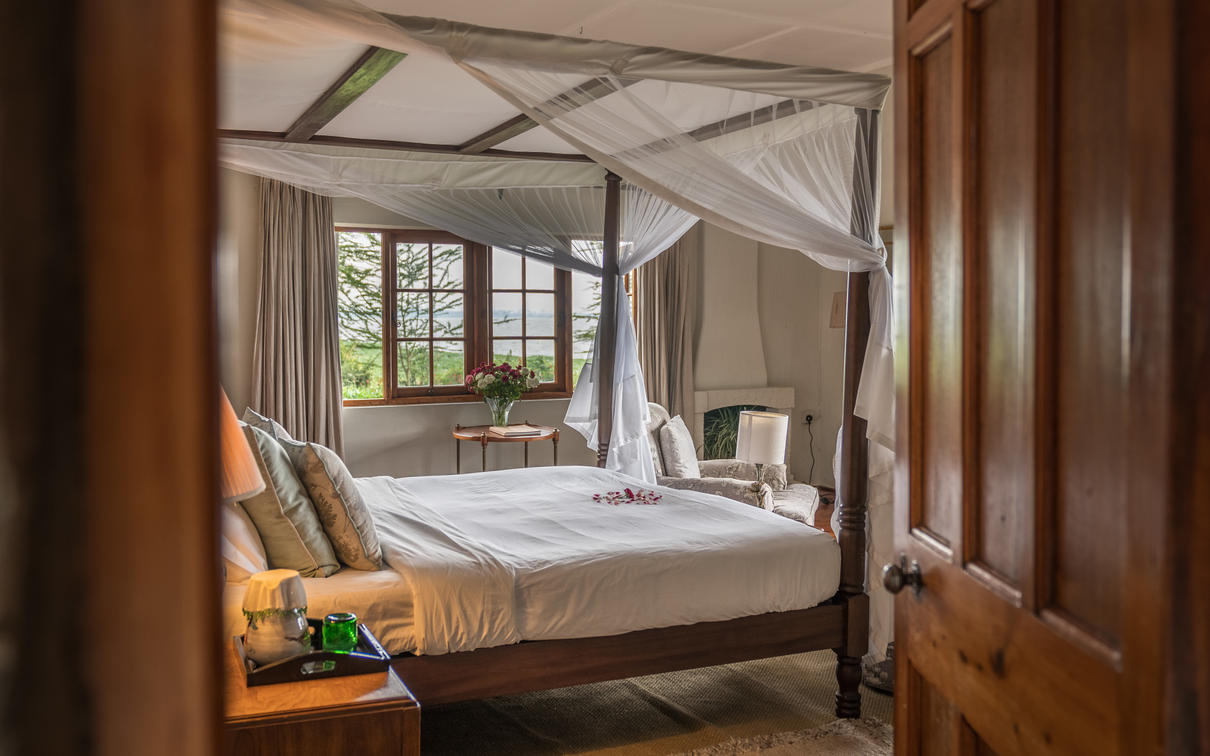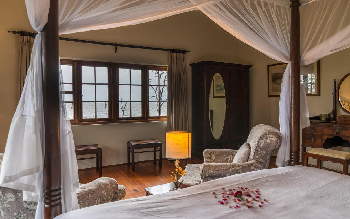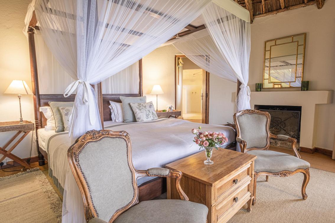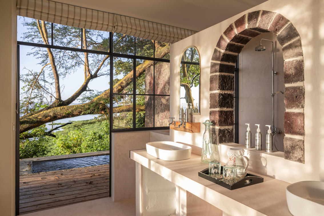 Each suite has a spacious bedroom that can be converted into a double or a twin with room for an extra bed if needed. A double-sided log-burning stove provides heat to the living room and the bedroom, transforming the suite into a cosy, warm space with a stunning focal point of flickering flames. The beautiful bathrooms feature double vanities, porcelain bathtubs, and double rain showers, while a comfortable indoor seating area offers breathtaking views through floor-to-ceiling windows. To guarantee privacy, each suite has its own entrance, verandah, and plunge pool overlooking Lake Naivasha.