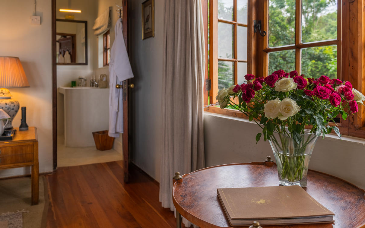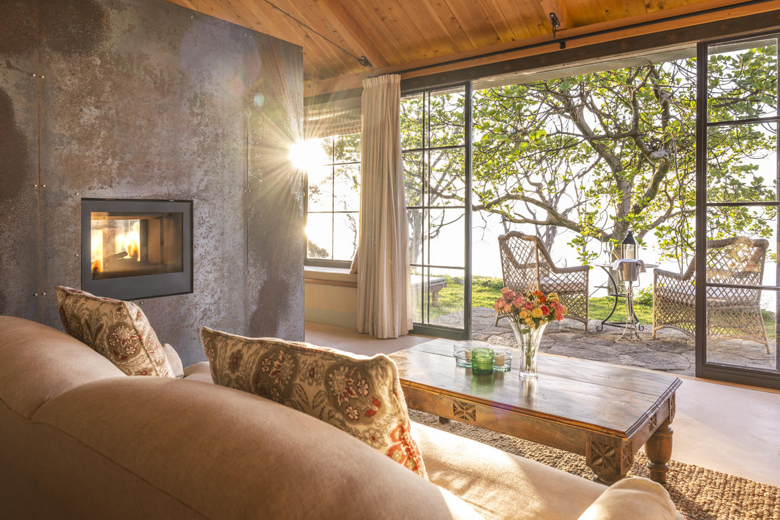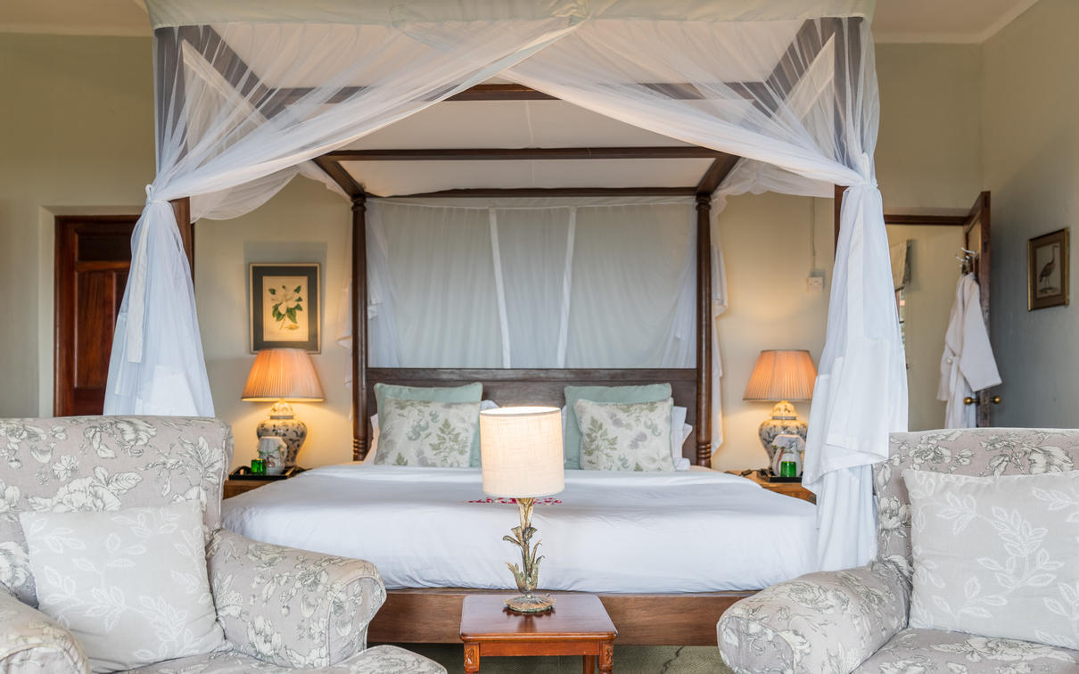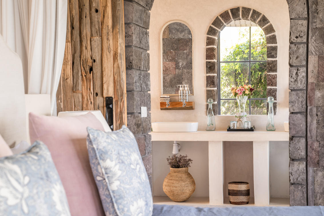 Each suite has a spacious bedroom that can be converted into a double or a twin with room for an extra bed if needed. A double-sided log-burning stove provides heat to the living room and the bedroom, transforming the suite into a cosy, warm space with a stunning focal point of flickering flames. The beautiful bathrooms feature double vanities, porcelain bathtubs, and double rain showers, while a comfortable indoor seating area offers breathtaking views through floor-to-ceiling windows. To guarantee privacy, each suite has its own entrance, verandah, and plunge pool overlooking Lake Naivasha.