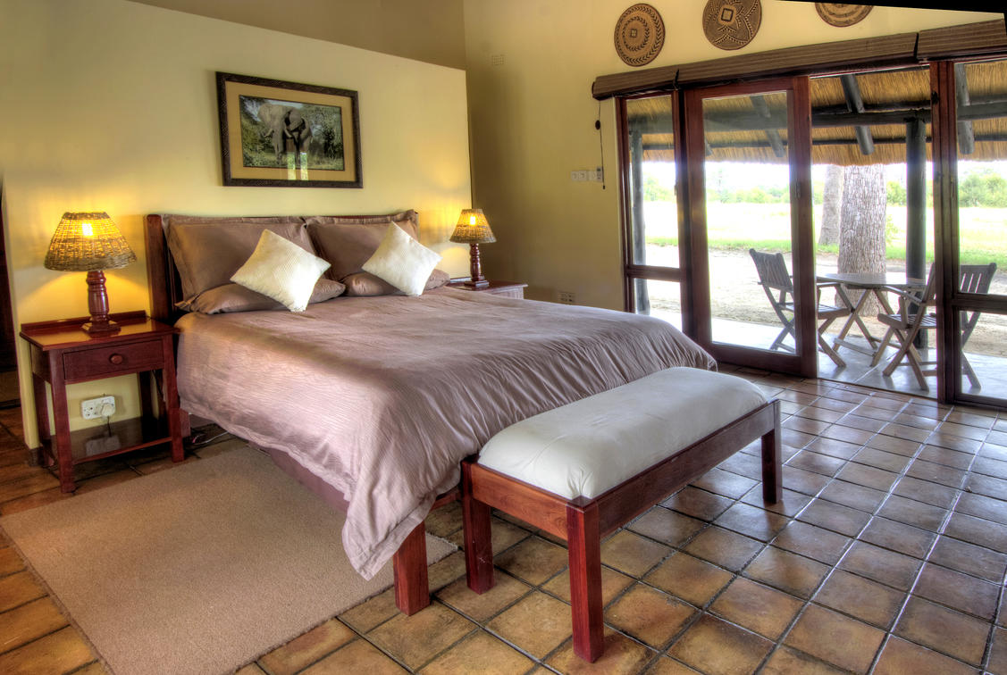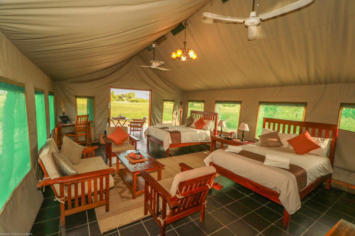 2 x Saddlebill Double Tents: 45 sq m tents on a raised deck, one with a kingsize bed and the other with a queen bed, overhead fans, en suite bathroom with shower, viewing deck overlooking the plains.