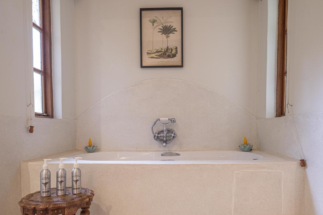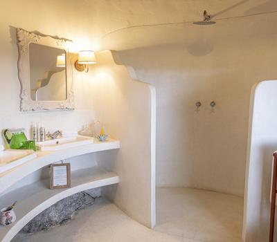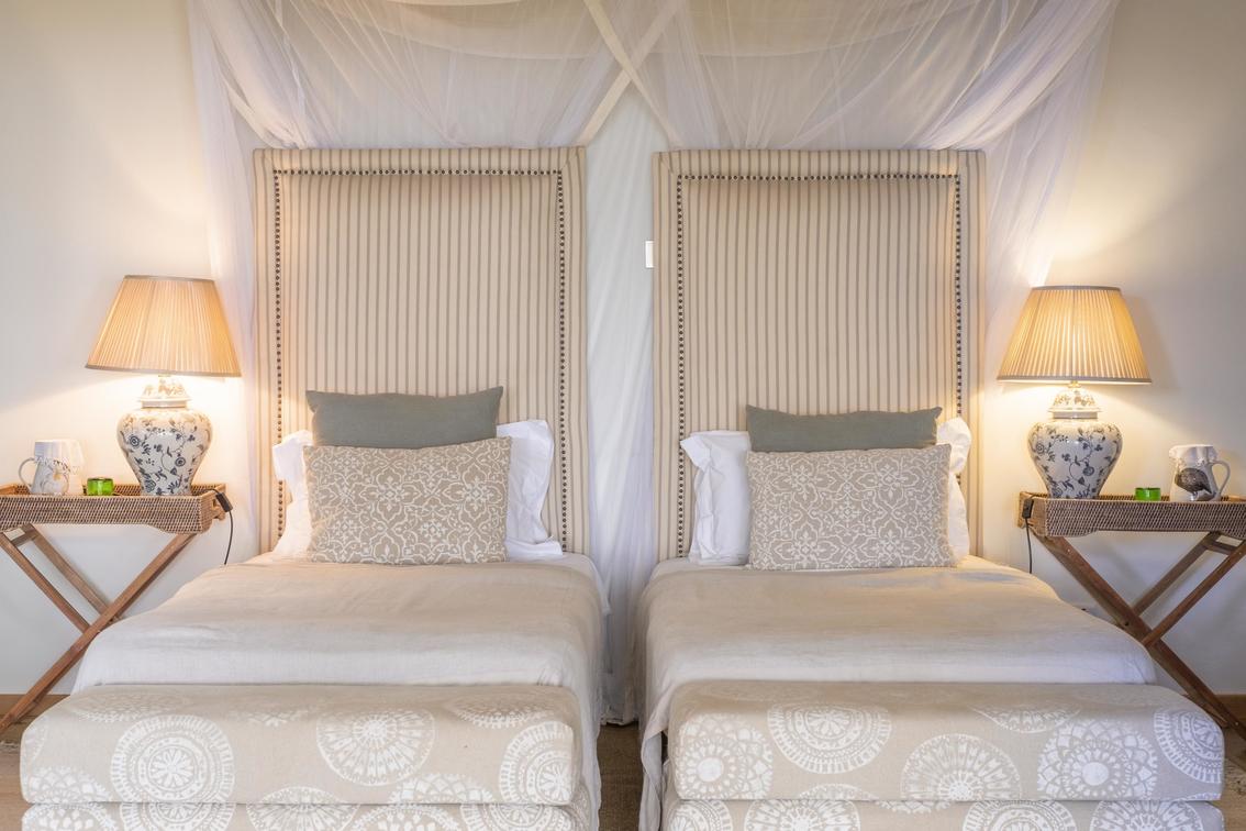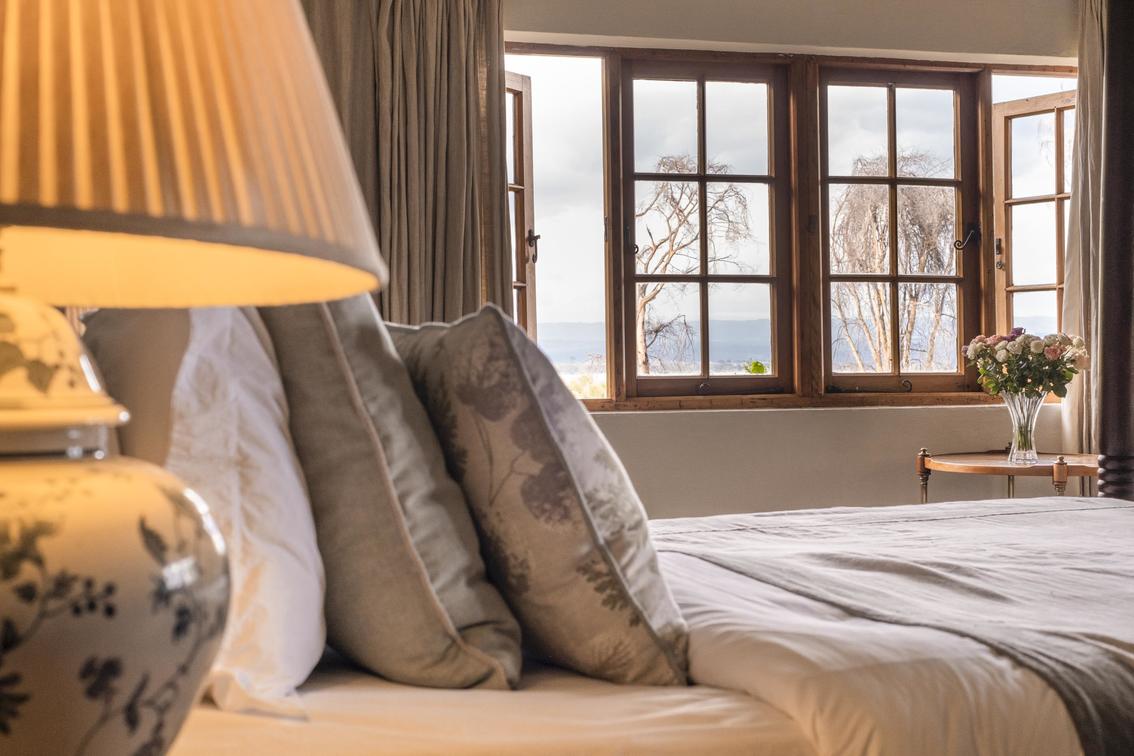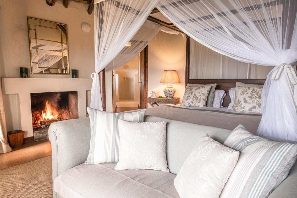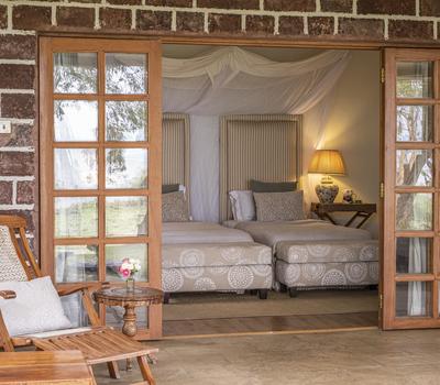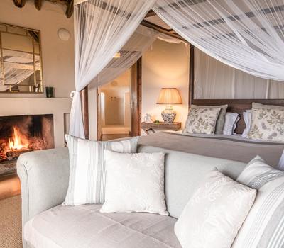 Each suite has a spacious bedroom that can be converted into a double or a twin with room for an extra bed if needed. A double-sided log-burning stove provides heat to the living room and the bedroom, transforming the suite into a cosy, warm space with a stunning focal point of flickering flames. The beautiful bathrooms feature double vanities, porcelain bathtubs, and double rain showers, while a comfortable indoor seating area offers breathtaking views through floor-to-ceiling windows. To guarantee privacy, each suite has its own entrance, verandah, and plunge pool overlooking Lake Naivasha.