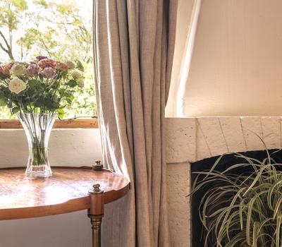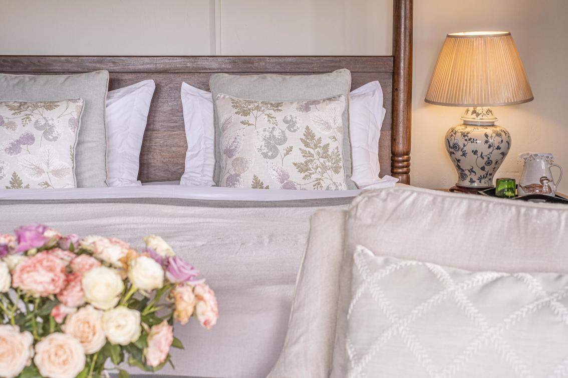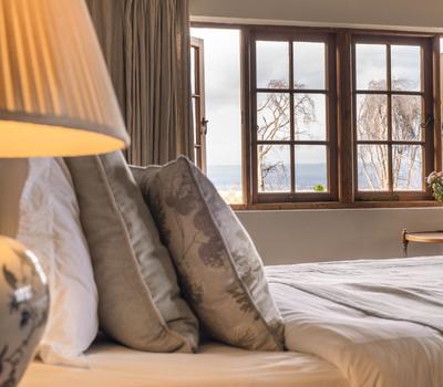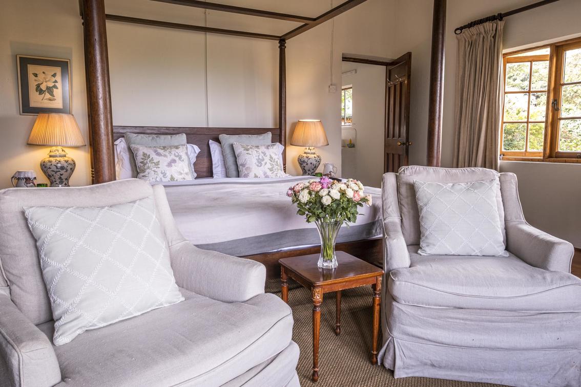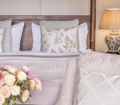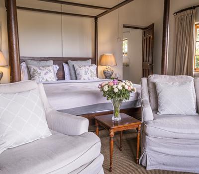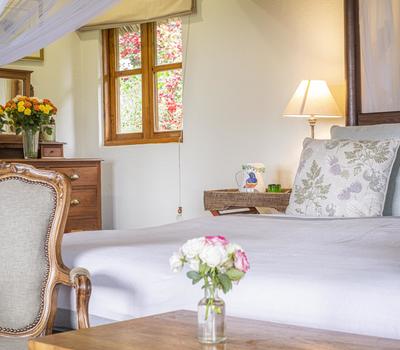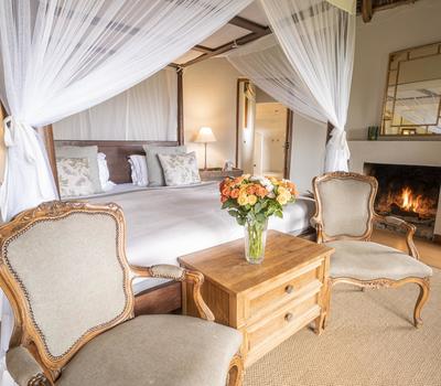 One spacious master bedroom in the main house and six country-style en-suite rooms with in-room fires among the pretty gardens.