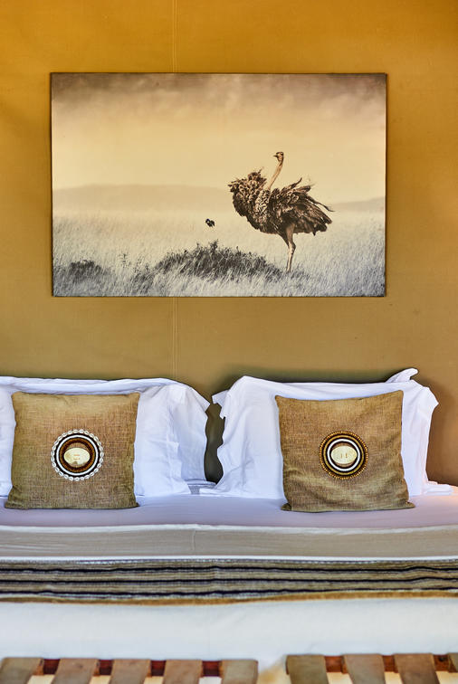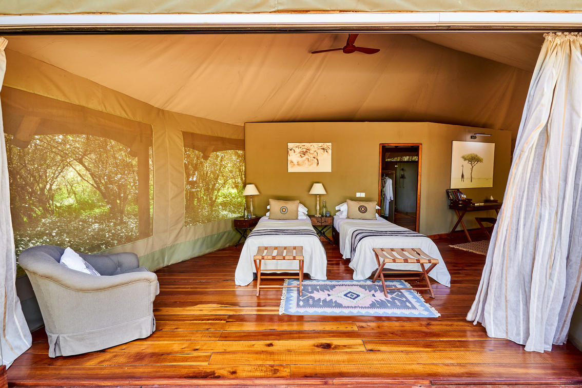 The Keekorok Family Tent can sleep up to six guests in a variety of layouts, depending on requirements. Both rooms can be doubles, twins or triples. Alternatively, the central lounge area contains a double sofa bed and can be separated by sliding doors to become a third bedroom. The two spacious en-suites each contain rain showers and free-standing copper bathtubs with fabulous views out into the wilderness.