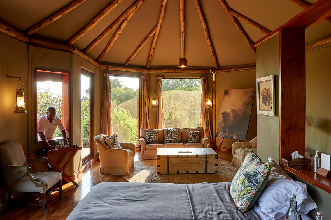 The Forest Family Tent can sleep up to five guests, each end of the open-plan room able to be configured as a twin or double, with an additional fifth bed upon request. A large veranda spans the length of the tent and a private deck is located a stone’s throw away beside the Sand River with views looking south into Tanzania. Here there is a private plunge pool and day bed, plus a sunken seating area and fire pit.