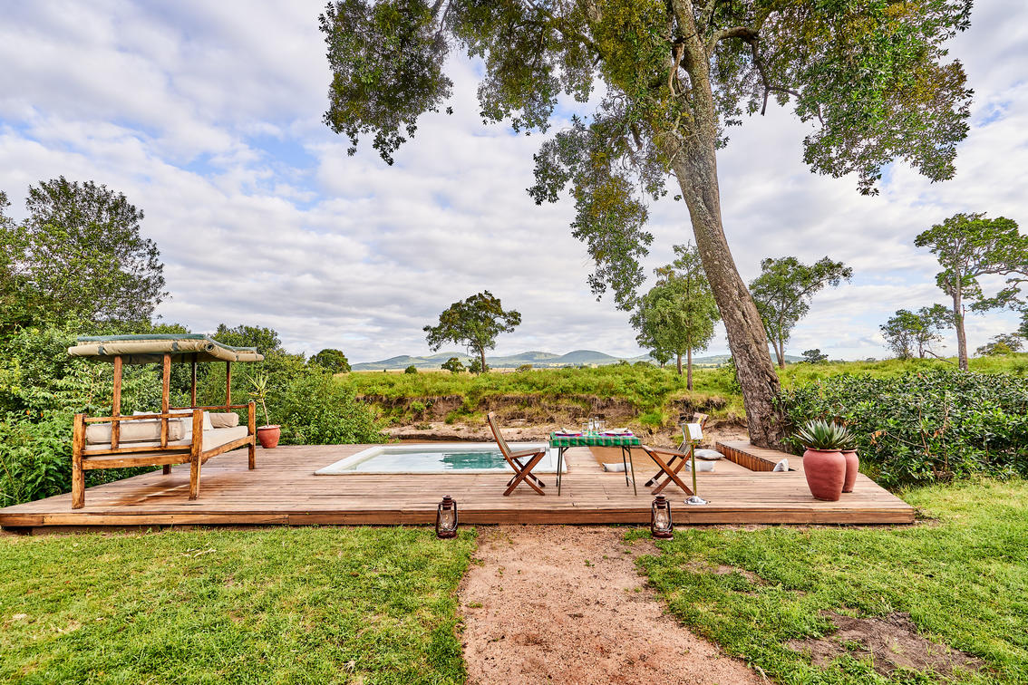 The Keekorok Family Tent, also referred to as Tent 2, is located on the corner where the Keekorok and Sand Rivers converge and is reached by crossing a small footbridge over the Keekorok River. The space boasts two roomy en-suite bedrooms, interconnected by a communal lounge area. This communal space forms the main entrance and is perfect for groups to relax in or even enjoy a private dining experience in if they wish. An enormous 108 square-metre wooden veranda spans the whole tent and provides a spectacular relaxation deck. Here you’ll find a private plunge pool, sunken seating, deck chairs and a hammock, all south facing, looking out across the Sand River and into Tanzania beyond.