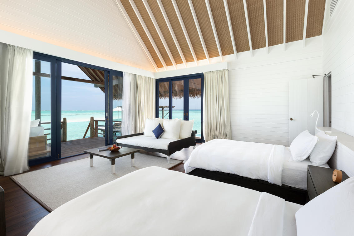 These light-filled villas sit on their own secluded jetty, each with a private entrance deck, surrounded by the aquamarine ocean. Outside, there’s a new private pool and a balcony with a daybed, where you can relax as the sun rises and sets on the ocean. Inside, the spacious living area with floor-to-ceiling windows provides plenty of space to unwind.