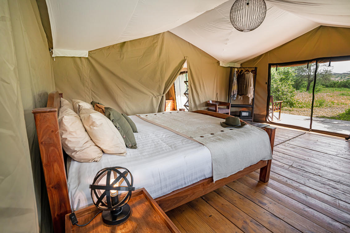 Your generously proportioned two-bedroom tent features comfortable double beds with warm, cozy duvets in both rooms – ideal for restful family nights after exciting days following the migration herds together. The private family outside deck becomes your personal viewing platform, offering beautiful vistas across the endless Serengeti plains where wildebeest and zebra roam freely.