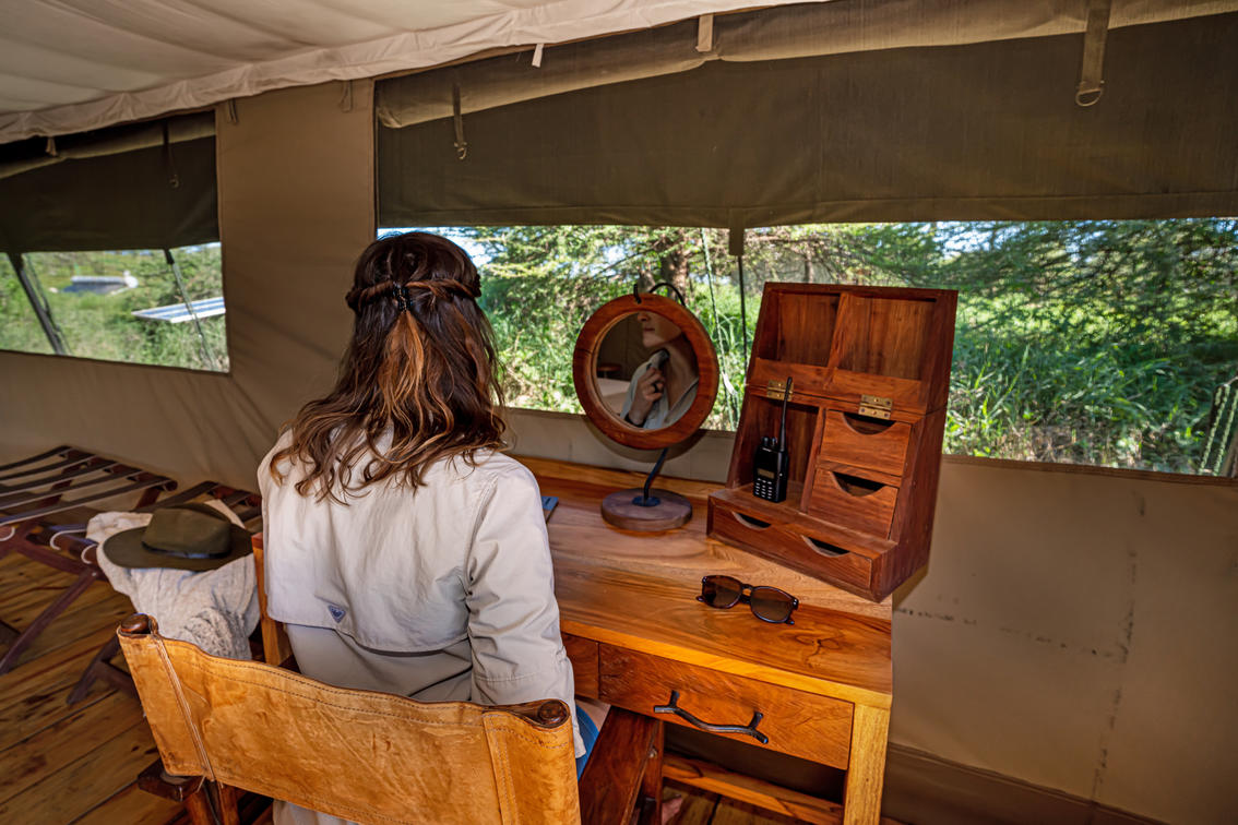 Your generously proportioned tent features twin double beds with warm, cozy duvets – ideal for restful nights after exciting days following the migration herds. The private outside deck becomes your personal viewing platform, offering beautiful vistas across the endless Serengeti plains where wildebeest and zebra roam freely.