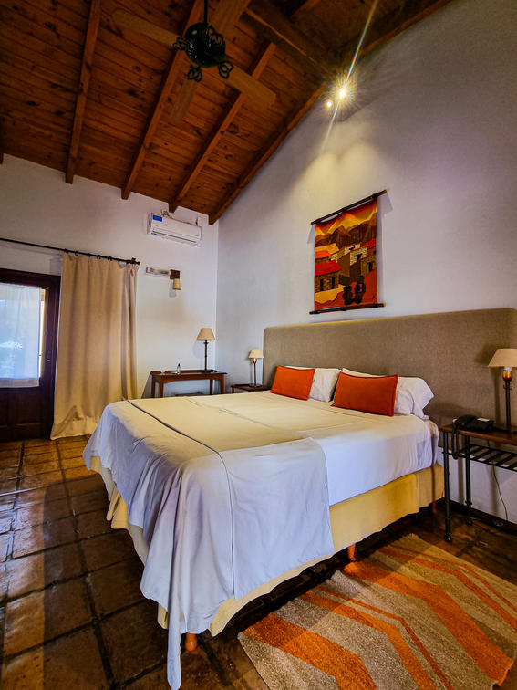 12 Standar Rooms (30 mts2) singlles, doubles and triples. The rooms have access to a spacious covered galeries overlooking the San Isidro Hill (3 rooms), and nine standards rooms with panoramic views looking to gardens, swimming pool, vineyards, and Cafayate Canyon. This rooms in a traditional and colonial style, offer private bathroom with bathtub, walk-in closet, hair dryer and safe-deposit box. Each room has Queen size bed (sommiers) or twin beds, direct telephones with DDN and DDI and access to WIF. All rooms have an individual electrical system or gas system for heating and air conditioning and ceiling fan. The rooms have television and mini-bar.