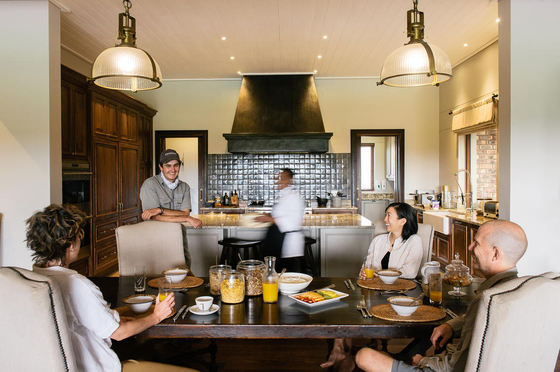 The outdoor spaces offer comfortable seating and a heated pool overlooking the reserve. Guests can enjoy al fresco dining in the pool terrace or the secluded boma, where meals are prepared by the private chef using locally sourced ingredients.