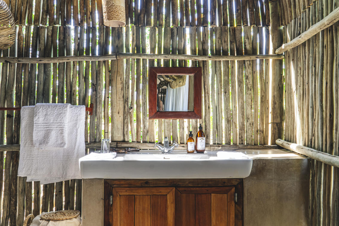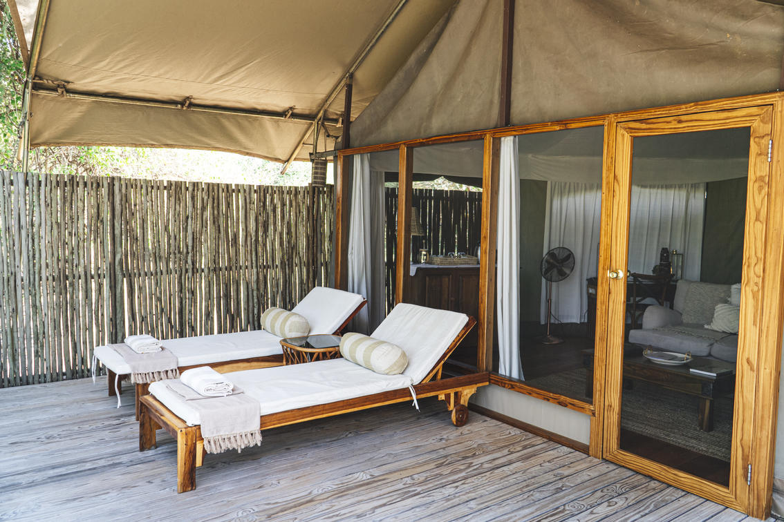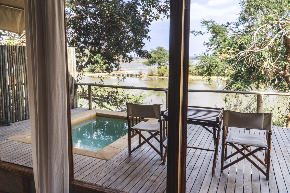 •a plunge pool set into the expansive wood deck with a stunning view of the Zambezi