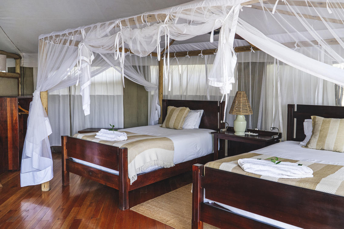 •two teak double beds placed within one well designed mosquito net, OR one Kingsize bed