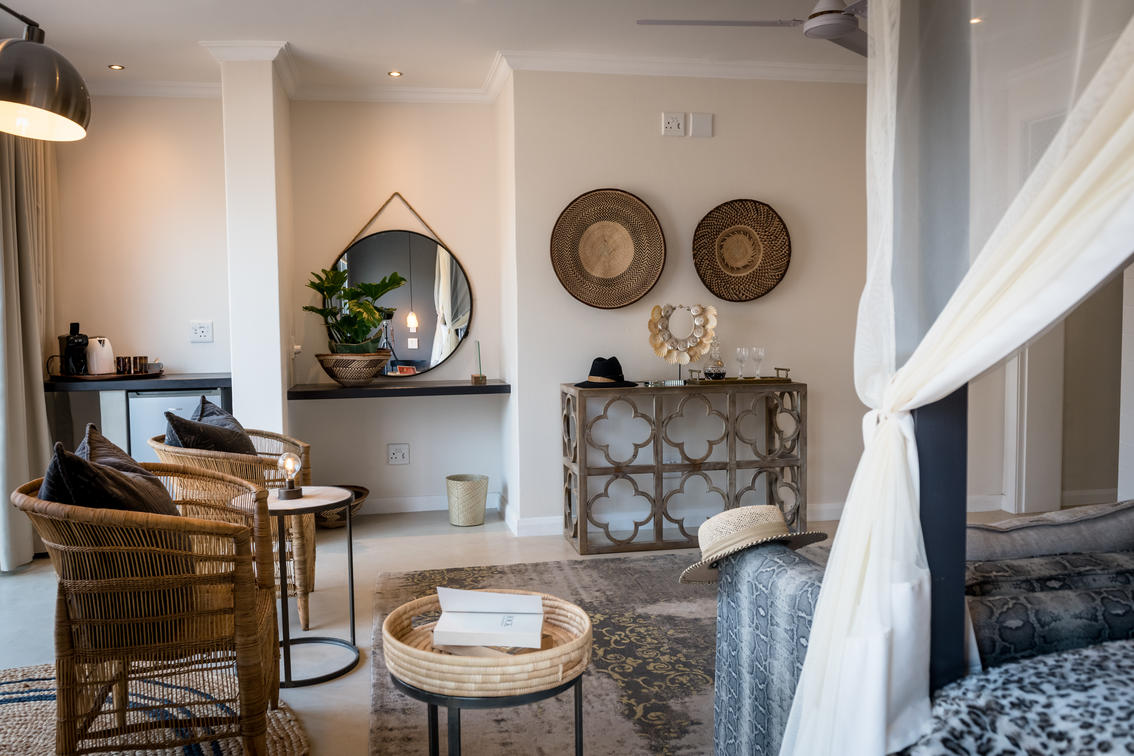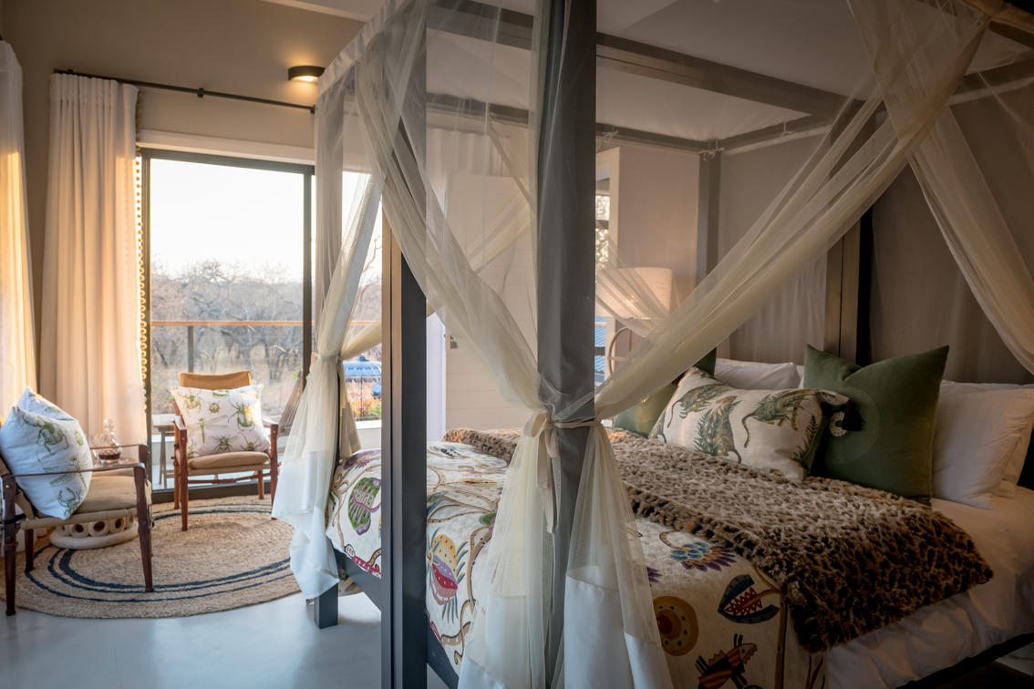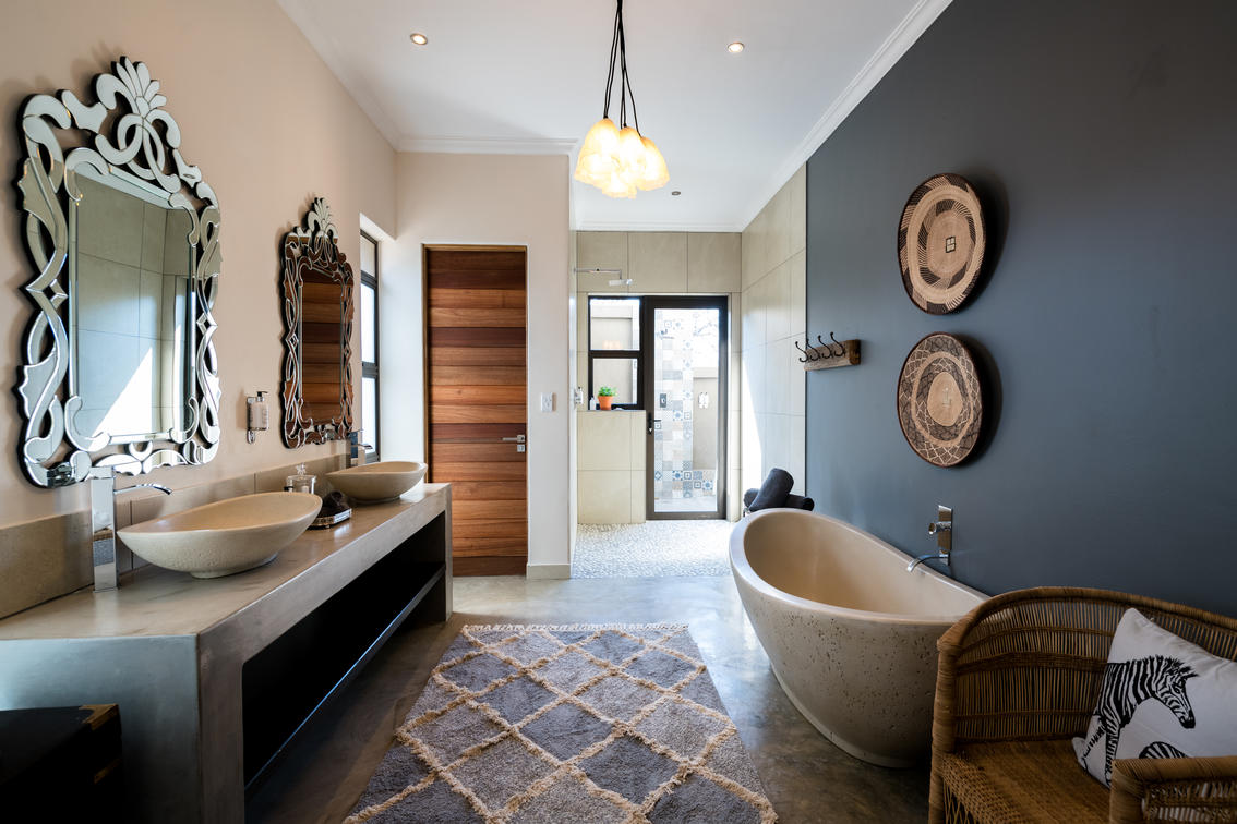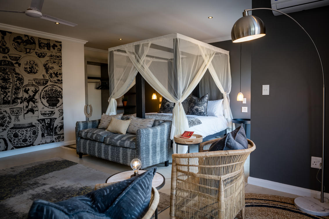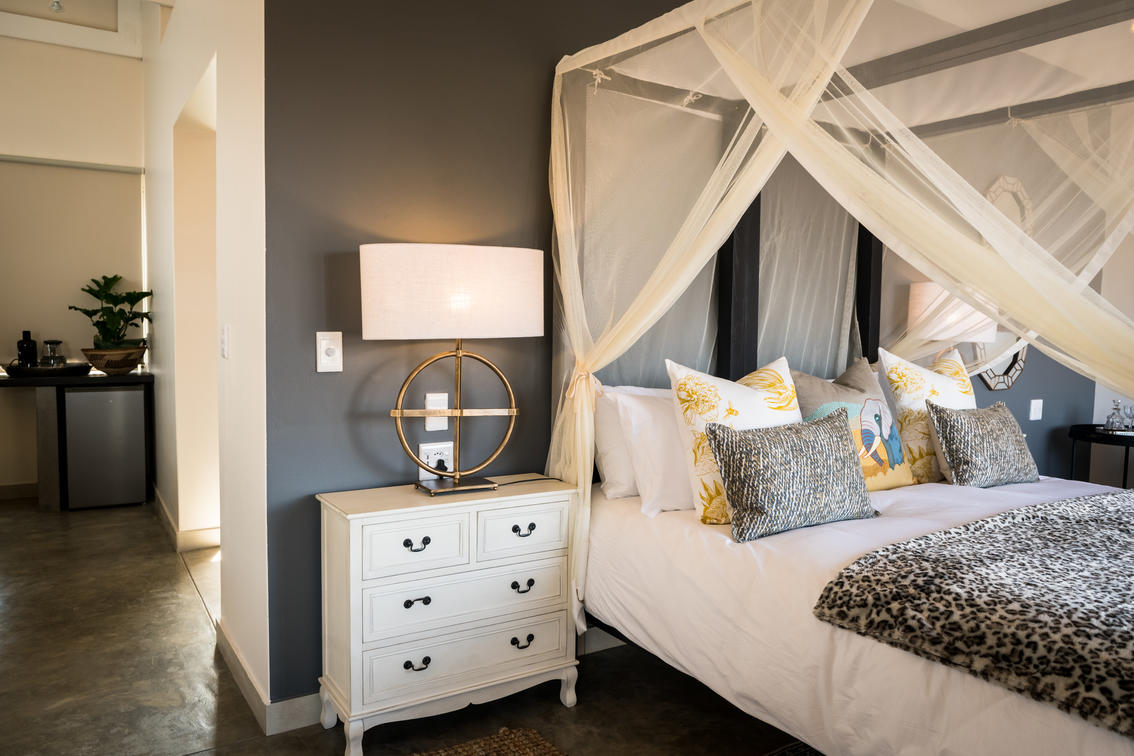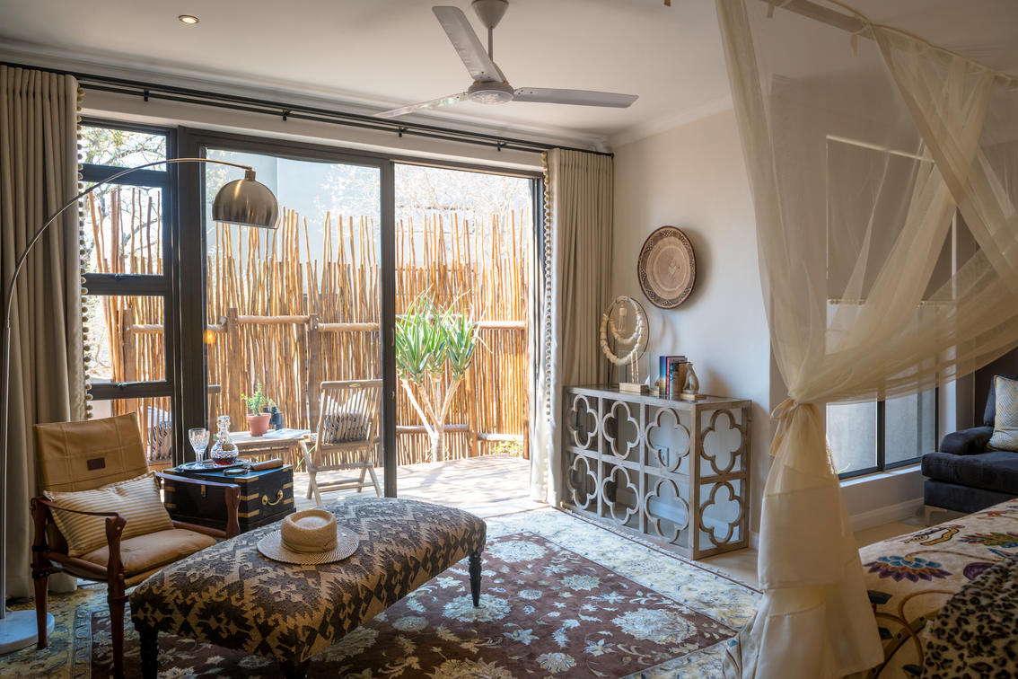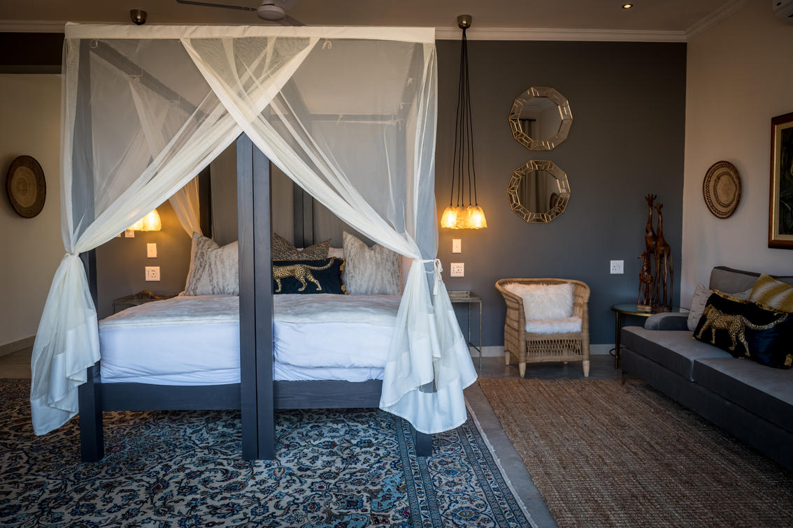Glamorous is the word that best describes the Deluxe suites which both feature a four-poster bed and can be found elevated above the bush-veld enjoying excellent views from a private deck.. A large Moroccan inspired outdoor shower also is a main feature in this suite overlooking the majestic Drakensberg Mountains range. Inside, a beautiful blue-hued Persian, bejewels the floor beneath your feet and beaded cluster chandelier bring light and elegance to the bathroom which boasts a freestanding stone bath, double vanity basin, walk-in shower and decorative details.