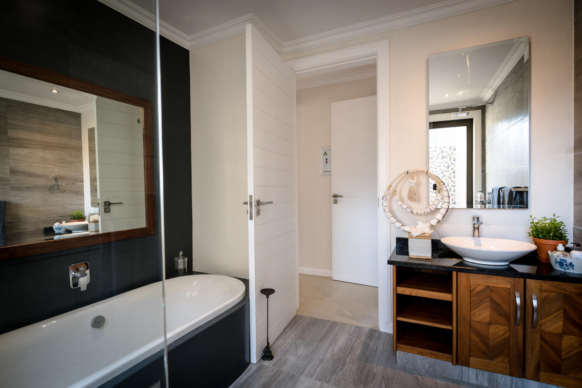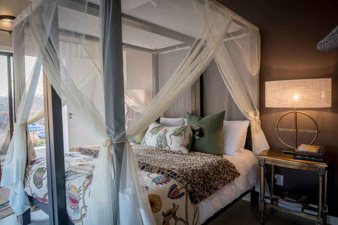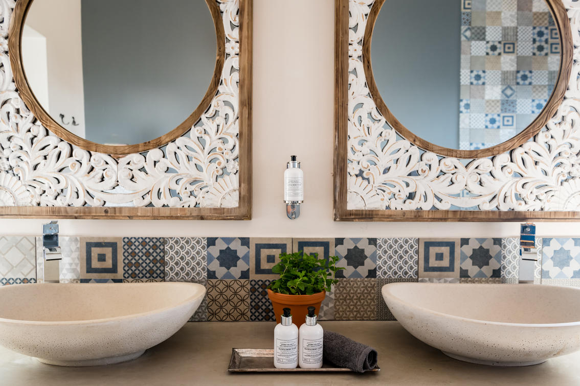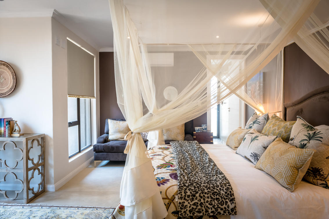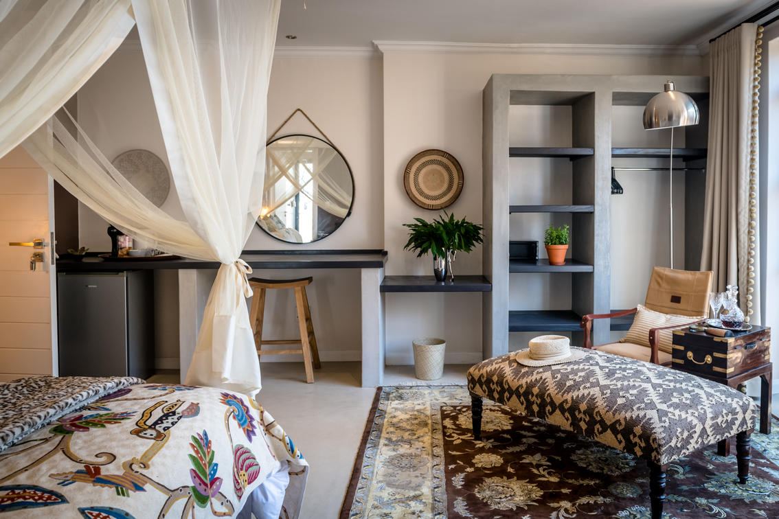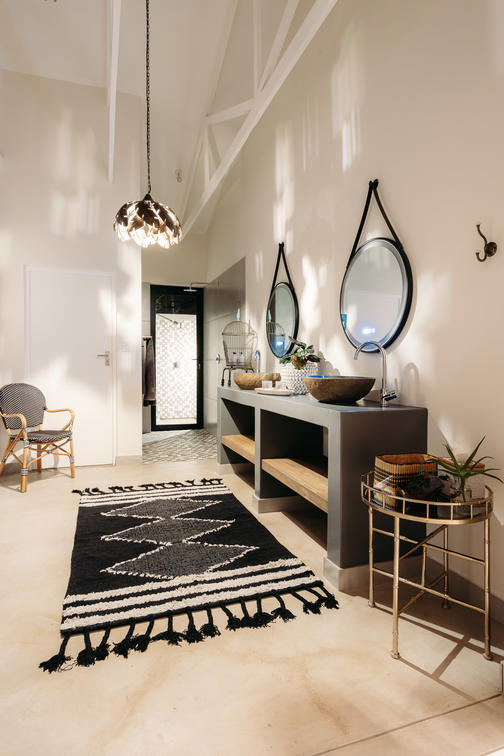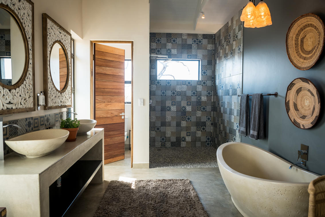 Glamorous is the word that best describes the Deluxe suites which both feature a four-poster bed and can be found elevated above the bush-veld enjoying excellent views from a private deck.. A large Moroccan inspired outdoor shower also is a main feature in this suite overlooking the majestic Drakensberg Mountains range. Inside, a beautiful blue-hued Persian, bejewels the floor beneath your feet and beaded cluster chandelier bring light and elegance to the bathroom which boasts a freestanding stone bath, double vanity basin, walk-in shower and decorative details.