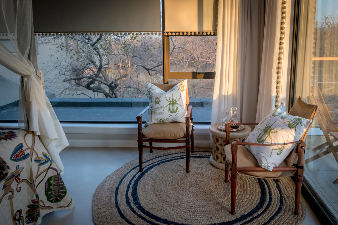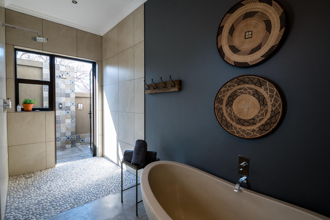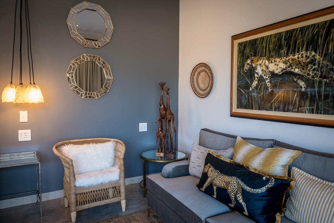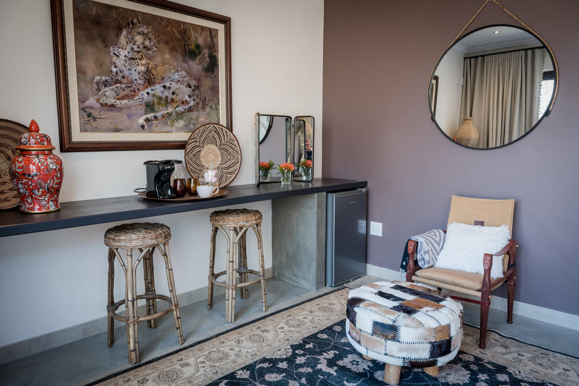 Named after the prickly porcupines that are often seen from the deck after dark, this room in on ground level and is one of the most spacious at 85 SQM in size and the most secluded of all the suites. Elegant touches include a Daniel Novella piece, Persian rugs, Melvin & Moon chairs, a large leopard oil painting by James Stroud, hanging palm lights and a 2.4m Ardmore wall hanging, making this the most colourful of spaces. The outside seating area nestles in nature and is particularly perfect for romantic sundowners. Indoors there are more lounge areas to sit back and enjoy the eclectic artwork which adorns this room. The bathroom boasts a double vanity basin, free-standing stone bath and both a spacious indoor / outdoor rain shower. Porcupine is for the wilder at heart.