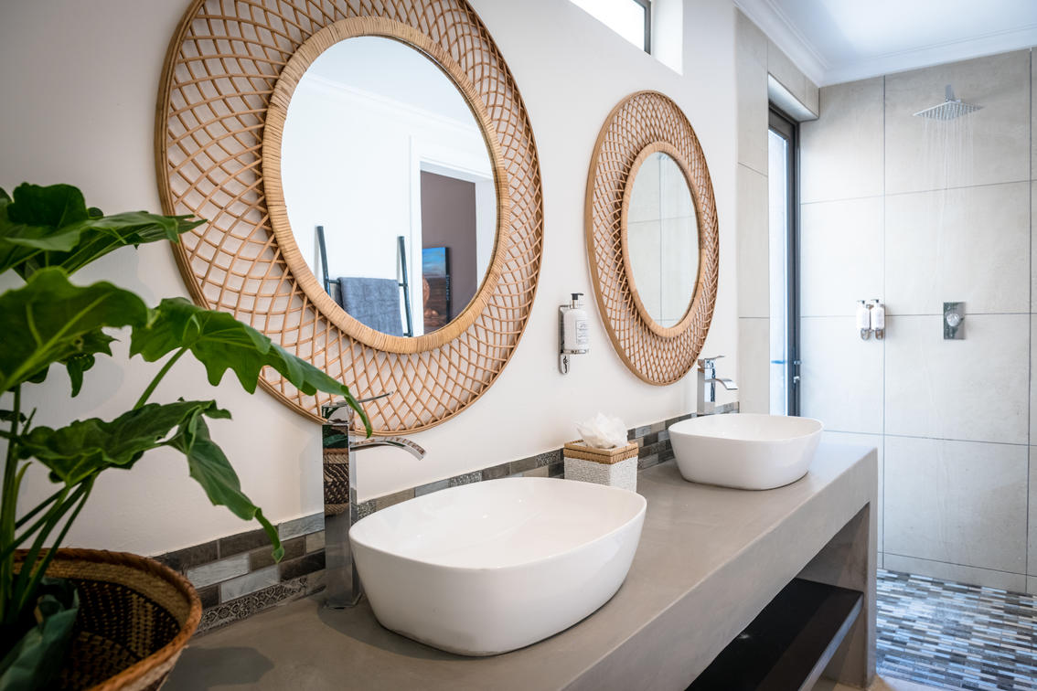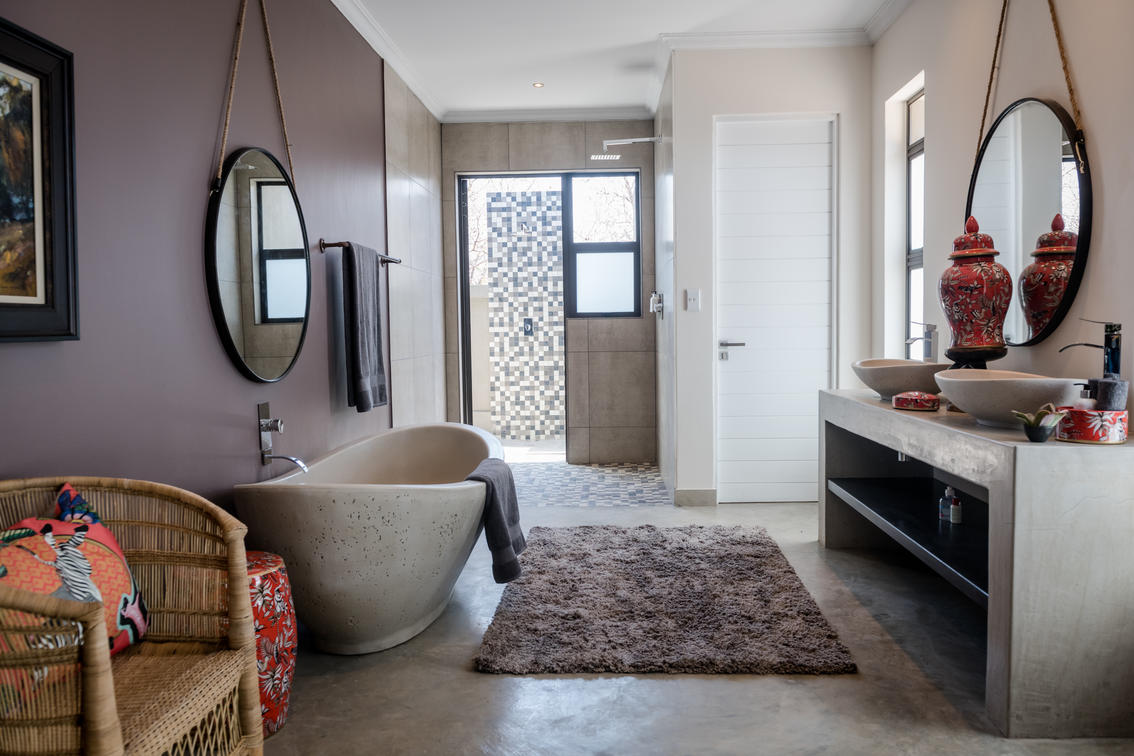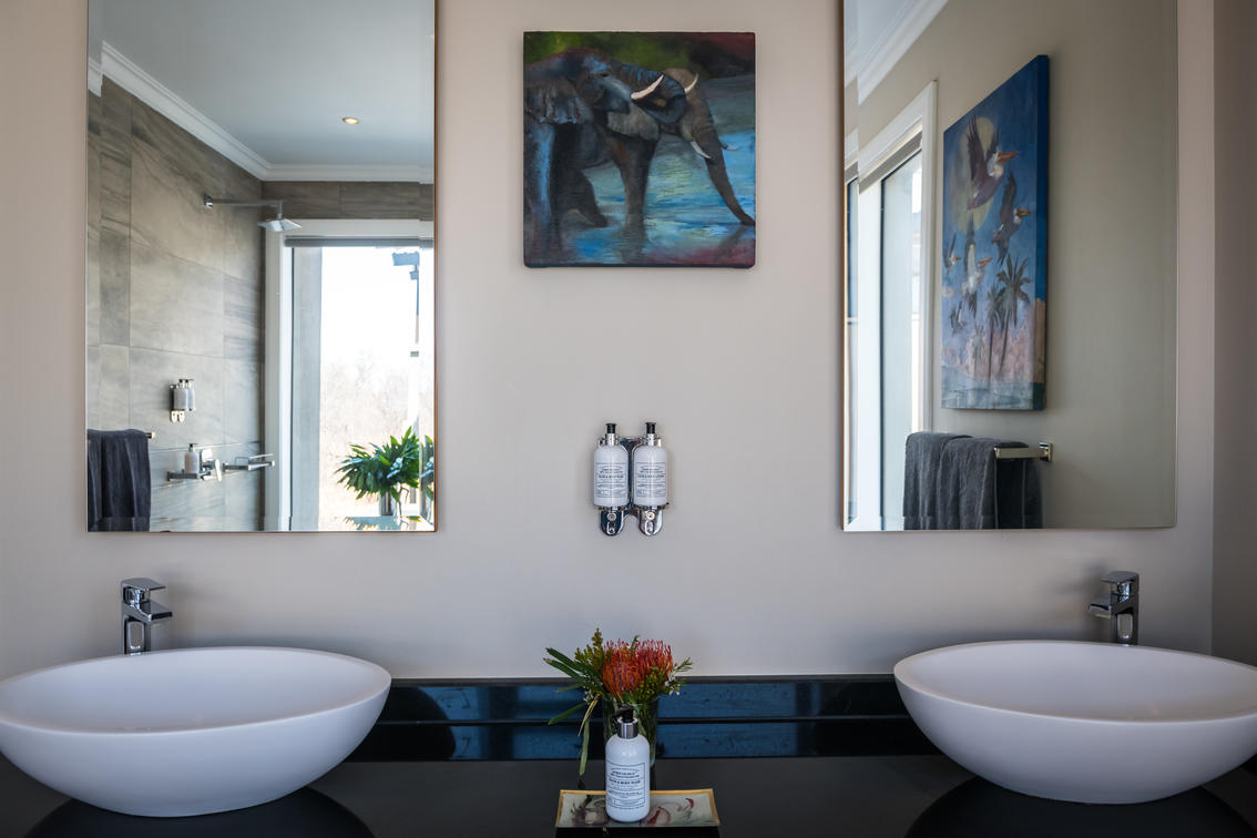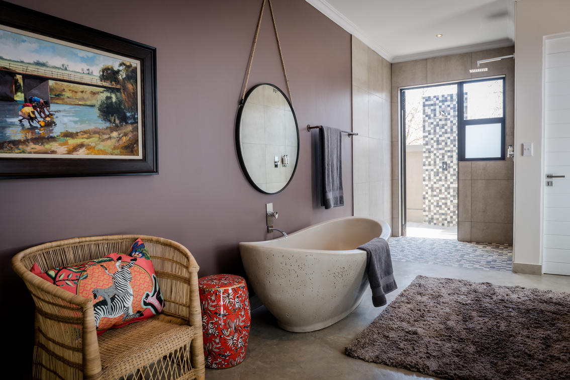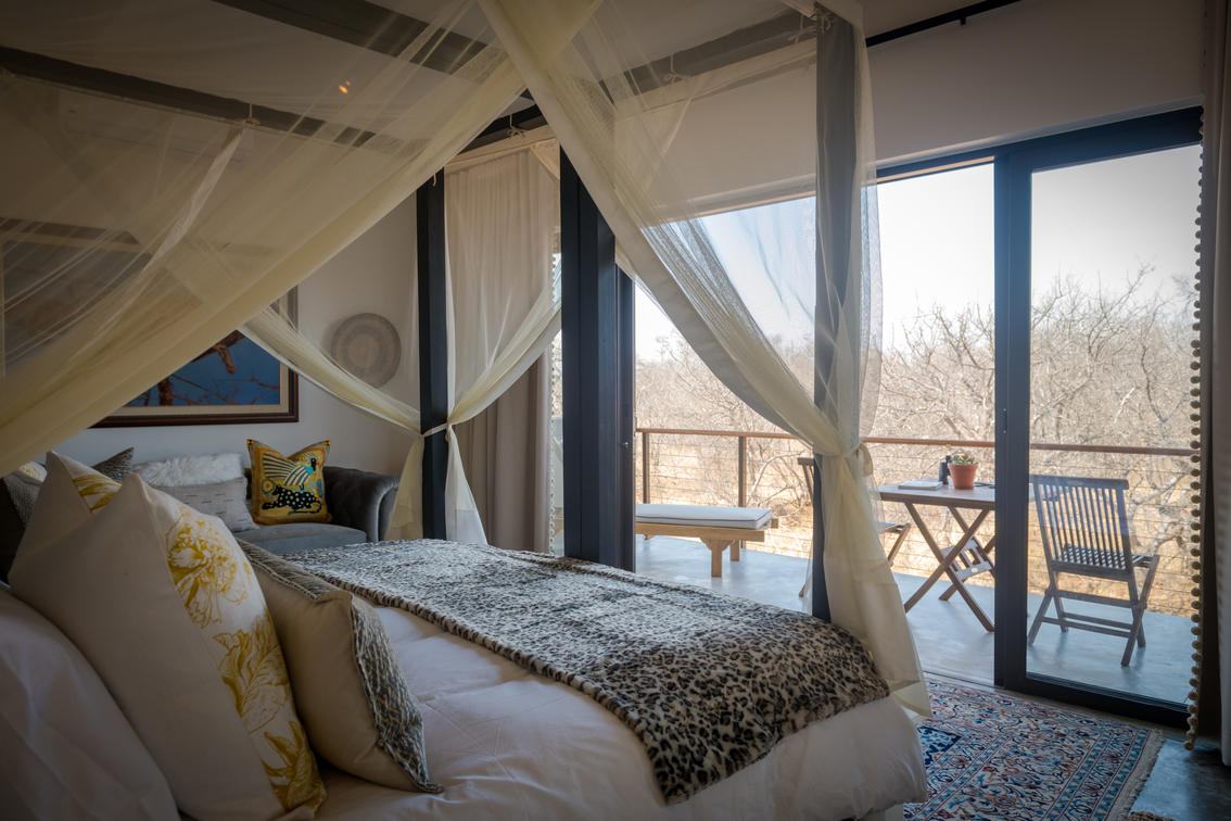 Named after the prickly porcupines that are often seen from the deck after dark, this room in on ground level and is one of the most spacious at 85 SQM in size and the most secluded of all the suites. Elegant touches include a Daniel Novella piece, Persian rugs, Melvin & Moon chairs, a large leopard oil painting by James Stroud, hanging palm lights and a 2.4m Ardmore wall hanging, making this the most colourful of spaces. The outside seating area nestles in nature and is particularly perfect for romantic sundowners. Indoors there are more lounge areas to sit back and enjoy the eclectic artwork which adorns this room. The bathroom boasts a double vanity basin, free-standing stone bath and both a spacious indoor / outdoor rain shower. Porcupine is for the wilder at heart.