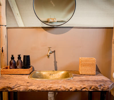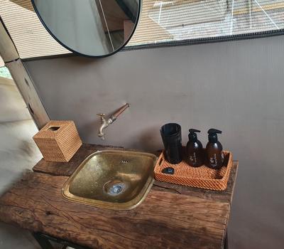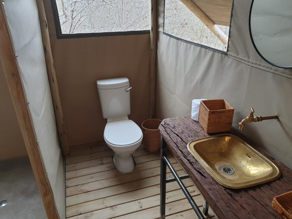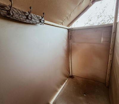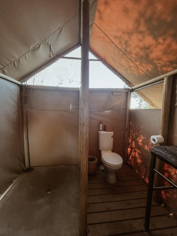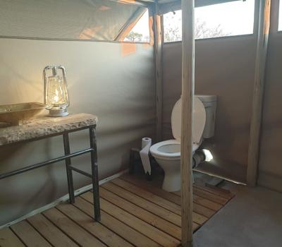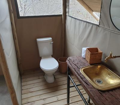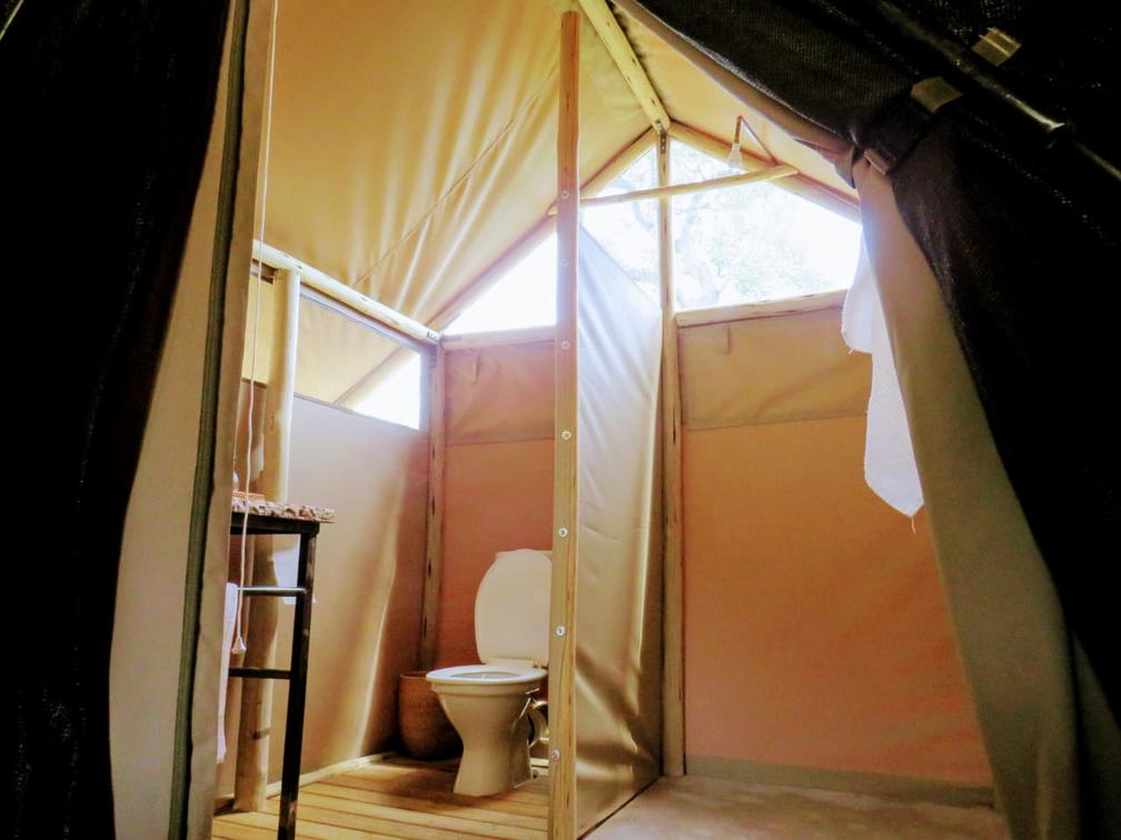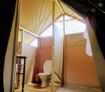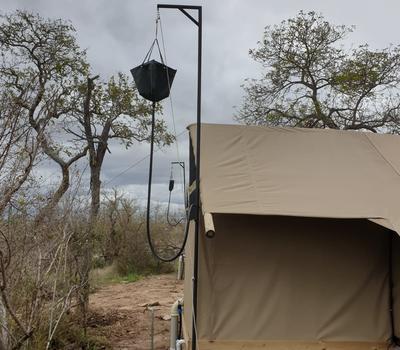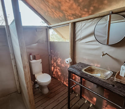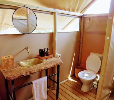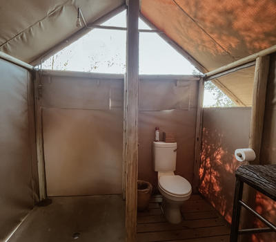 Each tent features a full en-suite bathroom equipped with a bucket shower, with hot water available on request, allowing guests to enjoy a traditional safari-style bathing experience. The bathrooms also include flushing toilets and running cold water.