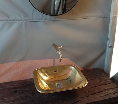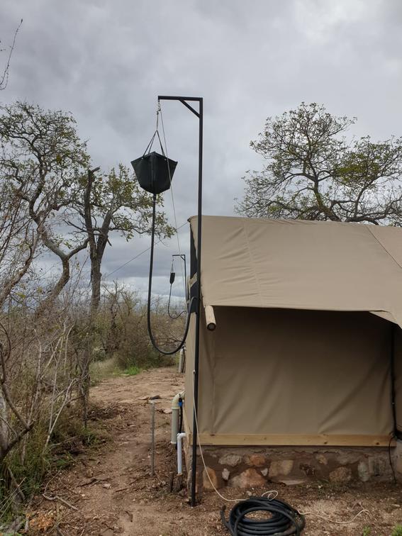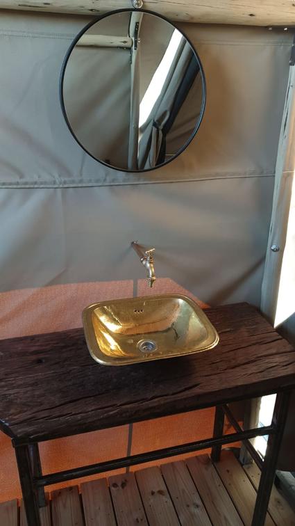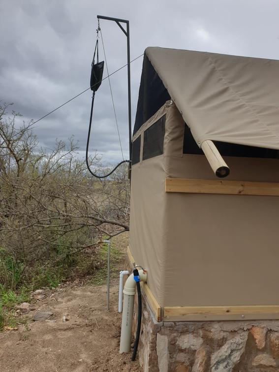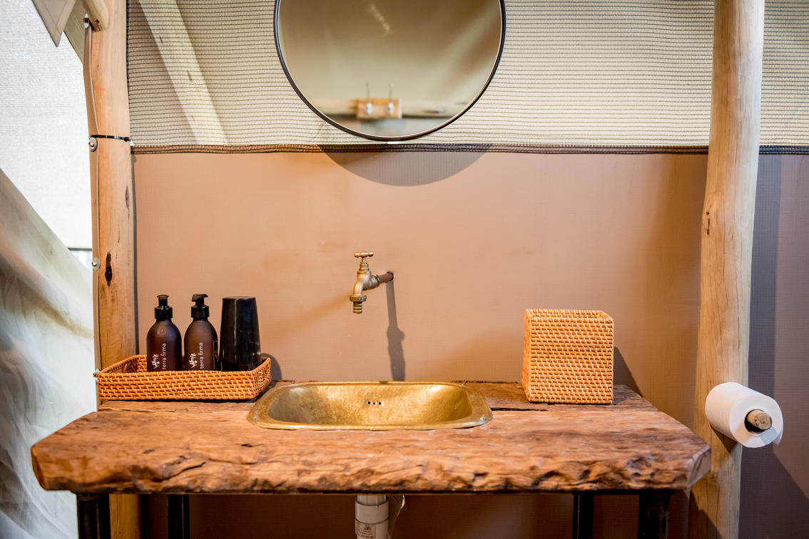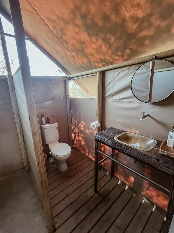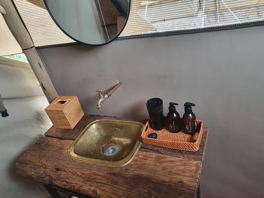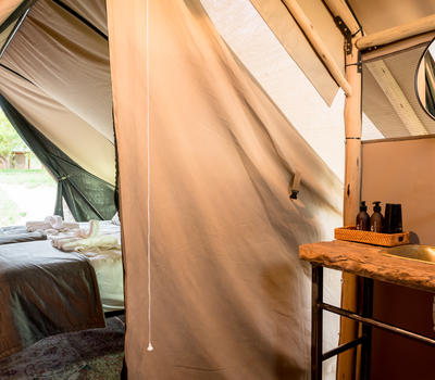 Each tent features a full en-suite bathroom equipped with a bucket shower, with hot water available on request, allowing guests to enjoy a traditional safari-style bathing experience. The bathrooms also include flushing toilets and running cold water.