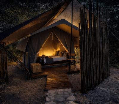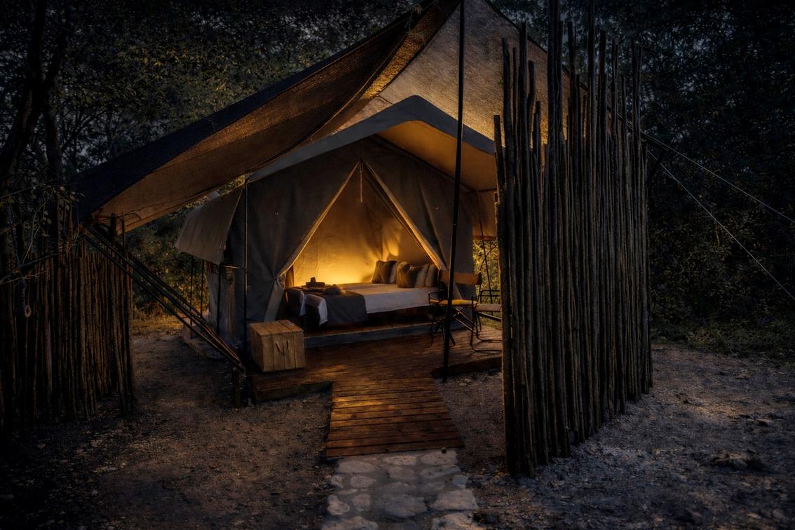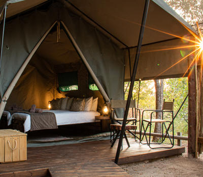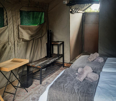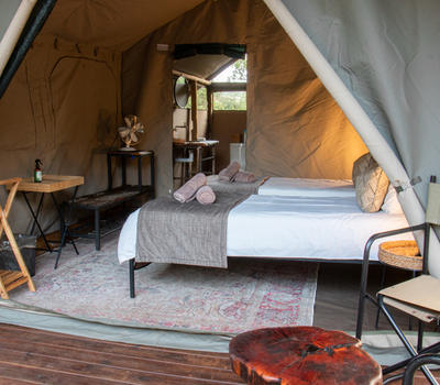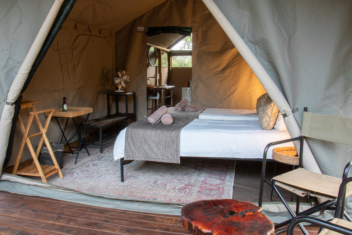Our en-suite safari tents offer a comfortable and authentic bush experience, ideal for guests seeking a classic explorer-style safari with subtle modern comforts. Each tent is furnished with twin beds that can be converted into a king-size configuration, providing flexible sleeping arrangements for couples or friends.