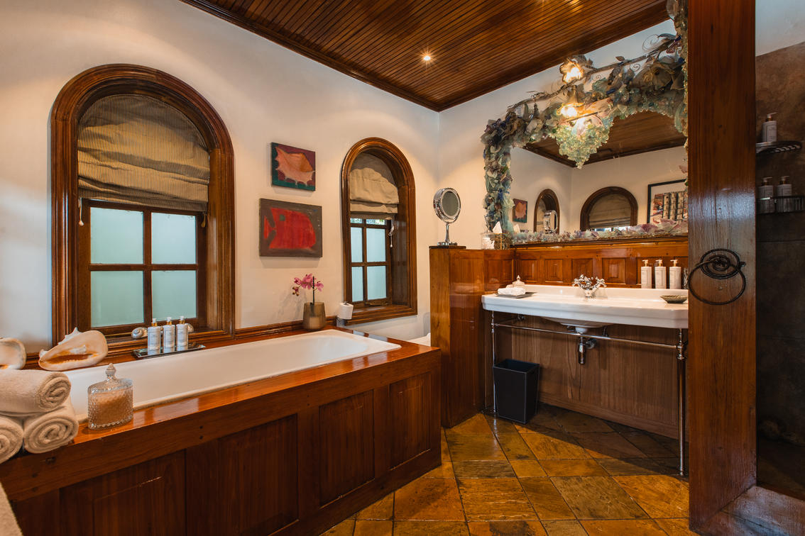 This room features a king size bed and ensuite bathroom with a large bathtub, over the bath shower and views into the tree canopy. This room cannot convert into a twin bed.
