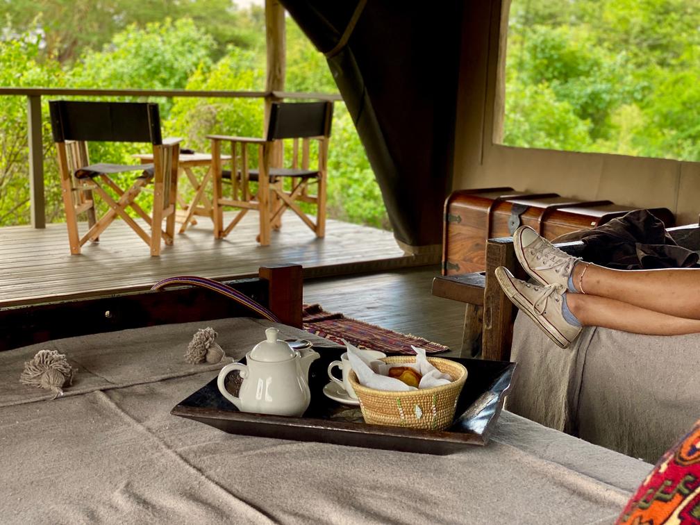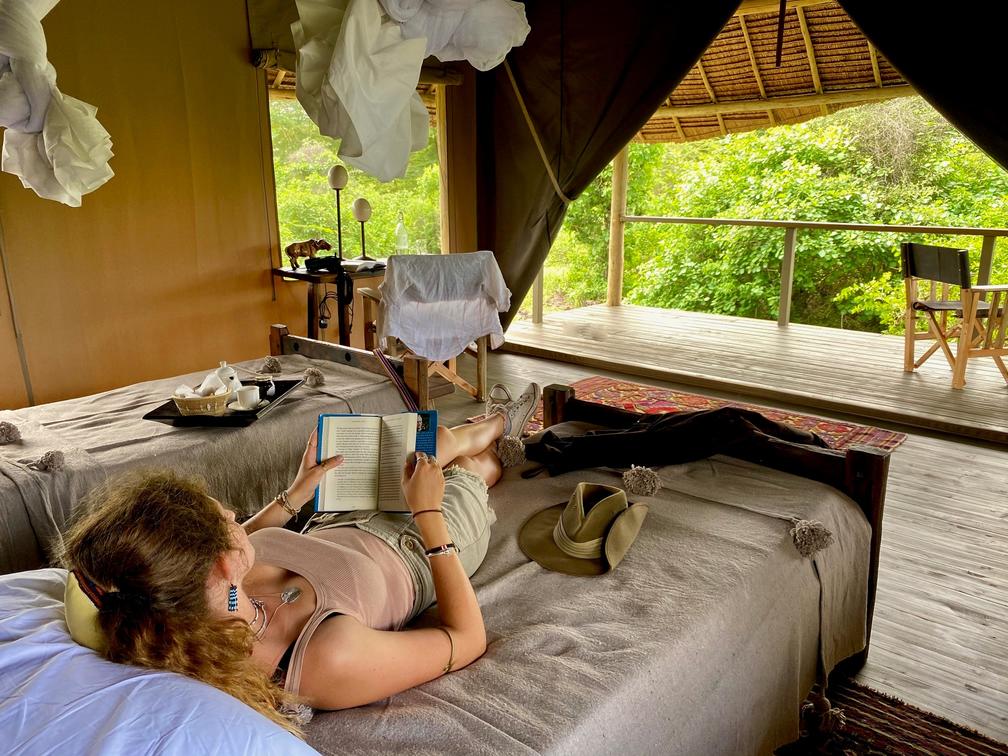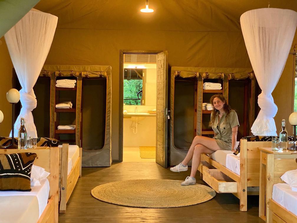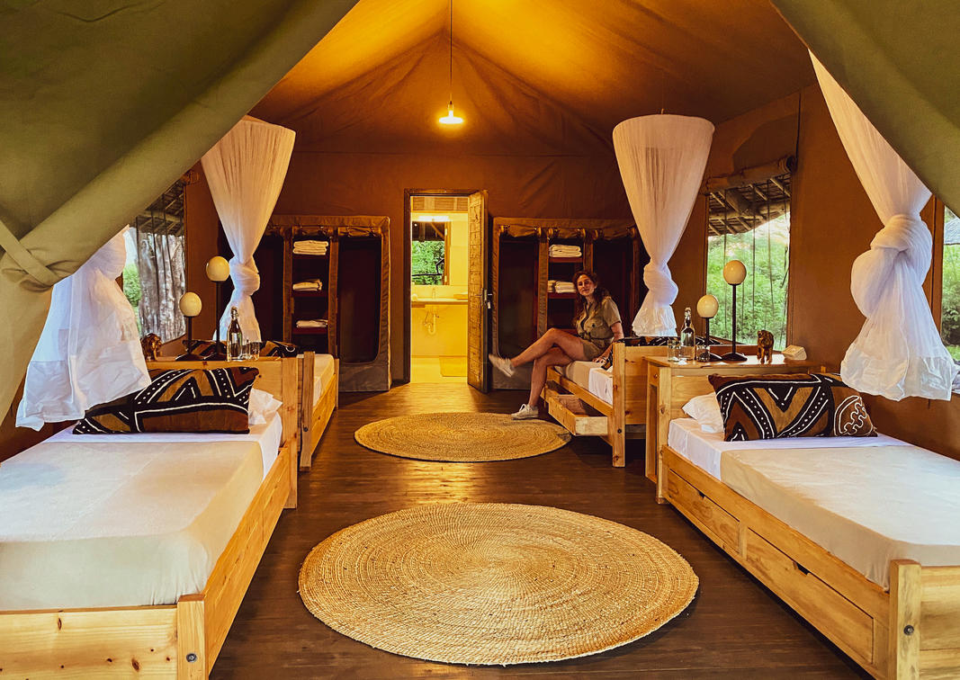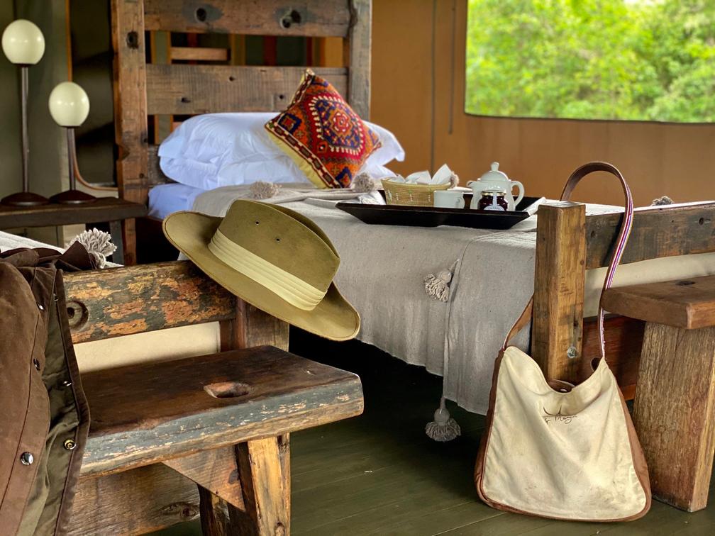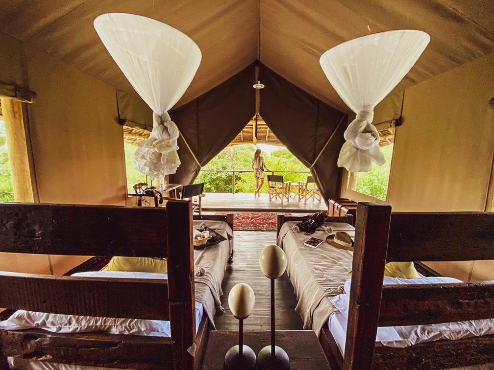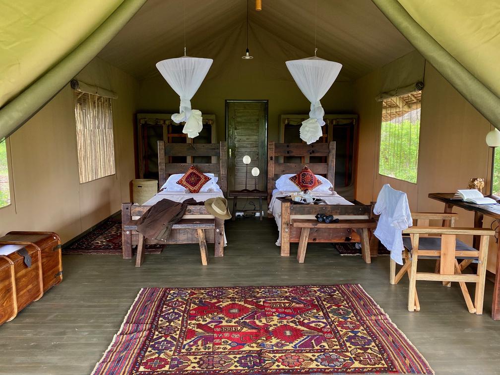 The Luxury Tented Cottage features two comfortable single beds with mosquito netting, bedside tables and lighting, ample storage, and a writing desk. A few Persian rugs adorn the floor, and every tent boasts an en-suite washroom with indoor and outdoor showers. An additional layer of canvas extending beyond the entrance forms a private veranda with outdoor seating where guests can relax and enjoy a beautiful view!