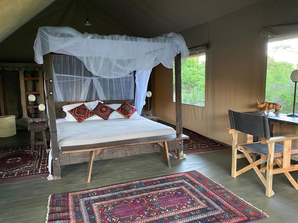 The Luxury Tented Cottage features a four-poster double bed with mosquito netting, bedside tables and lighting, ample storage, and a writing desk. A few Persian rugs adorn the floor, and every tent boasts an en-suite washroom with indoor and outdoor showers. An additional layer of canvas extending beyond the entrance forms a private veranda with outdoor seating where guests can relax and enjoy a beautiful view!