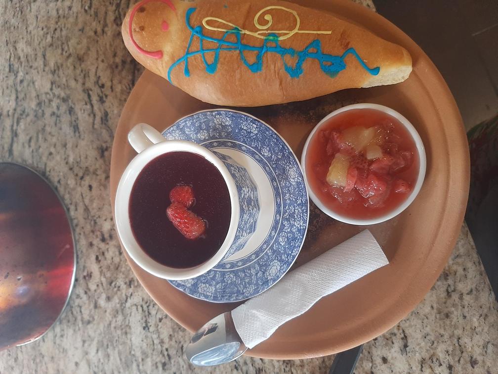 In our country, every second of November, they enjoy a tasty purple colada made from native fruits of our country, such as the mortiño, accompanied by a bus of bread.