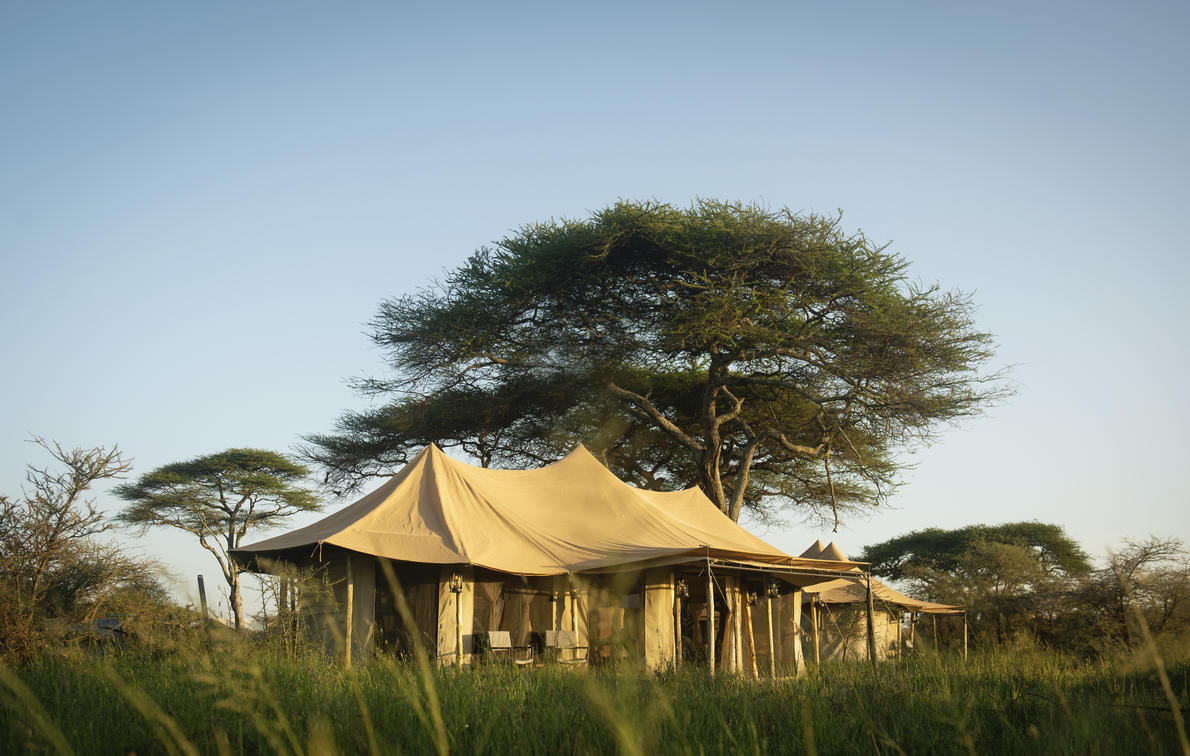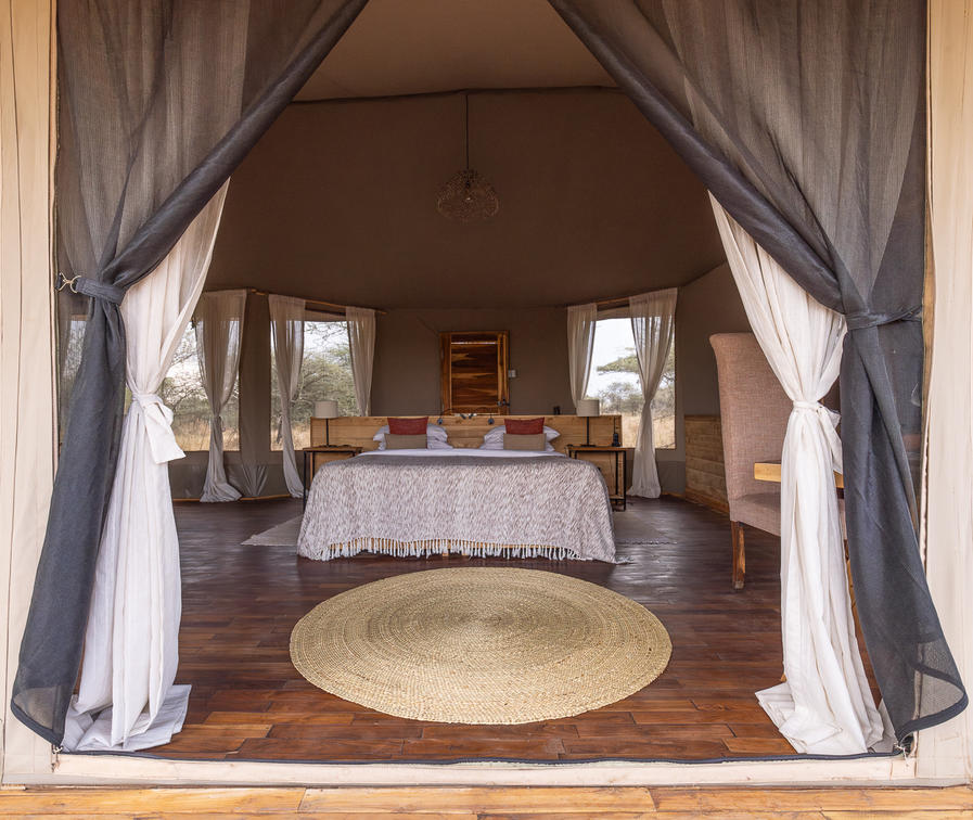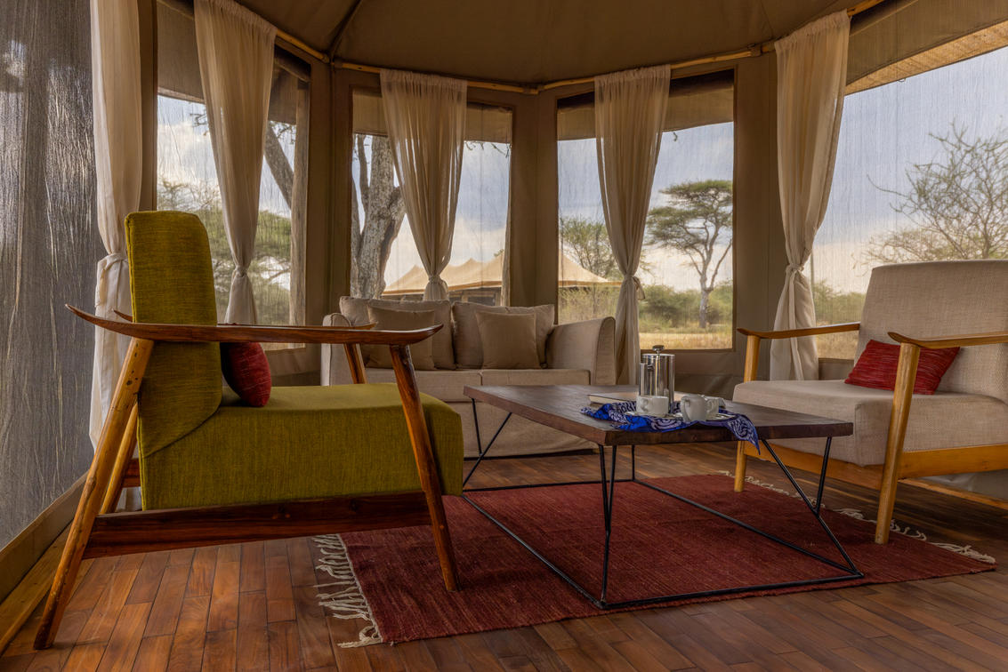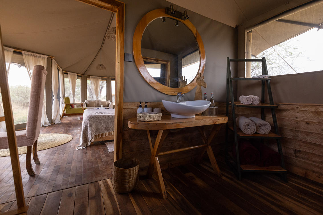 Olmara Camp's tented mini-suites are designed to merge with the eco-environment, all under canvas, and with expansive views of the wilderness ahead. Each tented mini-suite has a lounge cove with comfortable couches and coffee table, king-size bed with bedside tables and lamps, writing desks, full-length wall mirror, and soft carpets, laid over wooden floors. The suite flows into en suite bathroom with shower, double hand basins, and a flushing toilet. The camp is open, with no borders or rails, the wildlife comes and goes. Stay alert, eyes open; this is the Serengeti.